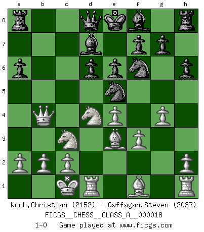 Last move : 1-0 2007 June 9 18:49:44 [Event "FICGS__CHESS__CLASS_A__000018"] [Site "FICGS"] [Date "2007.03.07"] [Round "1"] [White "Koch,Christian"] [Black "Gaffagan,Steven"] [Result "1-0"] [WhiteElo "2152"] [BlackElo "2037"] 1.e4 c5 2.Nf3 d6 3.d4 cxd4 4.Nxd4 Nf6 5.Nc3 a6 6.Be3 e6 7.f3 b5 8.g4 h6 9.Qd2 b4 10.Na4 Nbd7 11.O-O-O Ne5 12.Qxb4 Bd7 13.Nc3 1-0 This chess game has been lost on time (started : 2007.03.07 12:24:5) Sicilian : Najdorf, Byrne (English) attack Queenside Castling by player White (move 11) Player White won this chess game. Follow this game move after move (download)Excellence at Chess is one mark of a scheming mind. (Sir Arthur Conan Doyle) Unter Putin wird alles Geld aus Russland wie von einem Staubsauger nach Moskau umgeleitet, das ist wie ein schwarzes Loch. (Garry Kasparov) Los finales de Peón son del Ajedrez lo que el cesped es del Golf. (Cecil Purdy) La vie est comme un jeu d'échecs : nous esquissons un plan, mais celui-ci est tributaire de ce que daignent faire l'adversaire aux échecs et le destin dans la vie. (Arthur Schopenhauer) Kids, you tried your best and you failed miserably. The lesson is, never try. (Simpsons)