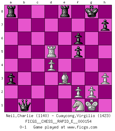 Last move : 0-1 2015 August 18 16:48:15 [Event "FICGS__CHESS__RAPID_E__000154"] [Site "FICGS"] [Date "2015.07.05"] [Round "1"] [White "Neil,Charlie"] [Black "Cuaycong,Virgilio"] [Result "0-1"] [WhiteElo "1140"] [BlackElo "1423"] 1.e4 e5 2.Nf3 Nf6 3.Nxe5 d6 4.Nf3 Nxe4 5.Nc3 Nf6 6.d4 Be7 7.Bd3 O-O 8.h3 Re8 9.O-O Nbd7 10.Bf4 c6 11.Ne4 Nxe4 12.Bxe4 Nb6 13.b3 Be6 14.c4 d5 15.Bd3 dxc4 16.bxc4 Bxc4 17.Re1 Bxd3 18.Qxd3 Nd5 19.Be3 Qd7 20.Ng5 g6 21.Qb3 Bb4 22.Re2 f6 23.Nf3 a5 24.a3 Bd6 25.Rae1 a4 26.Qc4 Bxa3 27.Ra1 b5 28.Qd3 Bd6 29.Nd2 Qe6 30.Rae1 Qf5 31.Qxf5 gxf5 32.Nf1 a3 33.Ra1 b4 34.Rc2 b3 35.Rxc6 b2 36.Rxd6 bxa1Q 37.Rxd5 Qb1 0-1 Petrov : Nimzovich attack Kingside Castling by player Black (move 7) Kingside Castling by player White (move 9) Promotion Queen by player Black (move 36) Player Black won this chess game. Follow this game move after move (download)I give 98 percent of my mental energy to Chess. Others give only 2 percent. (Bobby Fischer) Wenn ich gewinne bin ich ein Genie. Wenn nicht, dann bin ich keines. (Robert James Fischer) Todo lo que importa ante el tablero de Ajedrez son buenas jugadas. (Bobby Fischer) Votre seul travail dans les ouvertures est d'obtenir un milieu de partie jouable. (Lajos Portish) Experience is the name we all give to our mistakes. (Oscar Wilde)