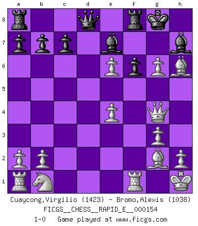 Last move : 1-0 2015 July 30 20:30:27 [Event "FICGS__CHESS__RAPID_E__000154"] [Site "FICGS"] [Date "2015.07.05"] [Round "1"] [White "Cuaycong,Virgilio"] [Black "Bromo,Alexis"] [Result "1-0"] [WhiteElo "1423"] [BlackElo "1038"] 1.Nf3 d5 2.g3 Nc6 3.d4 Nf6 4.Bg2 h6 5.O-O Bf5 6.c4 e6 7.Ne5 Nxe5 8.dxe5 Nd7 9.cxd5 Nxe5 10.f4 Ng4 11.e4 Bh7 12.Qxg4 Bc5+ 13.Kh1 O-O 14.dxe6 f6 15.f5 Be7 16.Bxh6 g5 17.fxg6 1-0 Reti : King's Indian attack (Barcza system) Kingside Castling by player White (move 5) Kingside Castling by player Black (move 13) Player White won this chess game. Follow this game move after move (download)Chess is really ninety nine percent calculation. (Soltis) Im Schach gibt es keinen Platz für Galanterie. (Irving Chernev) Botvinnik trataba de restarle el misterio al Ajedrez, siempre relacionandolo a situaciones de la vida ordinaria. El gustaba de llamar al Ajedrez un típico problema inexacto similar a aquellos de los cuales la gente siempre tiene que enfrentarse en la vida cotidiana. (Garry Kasparov) Des idées, des idées, j'en ai cent, j'en ai mille. Des bonnes, des mauvaises, applicables, irréalisables... Il suffit de faire le tri ! (Roos) Happy endings are just stories that haven't finished yet. (Jane Smith in Mr & Mrs Smith)