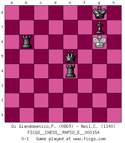 Last move : 0-1 2015 August 19 23:37:32 [Event "FICGS__CHESS__RAPID_E__000154"] [Site "FICGS"] [Date "2015.07.05"] [Round "1"] [White "Di Giandomenico,Pierino"] [Black "Neil,Charlie"] [Result "0-1"] [WhiteElo "0869"] [BlackElo "1140"] 1.e4 e5 2.d3 Bc5 3.Nf3 Nc6 4.Be2 d6 5.O-O f5 6.Bg5 Nf6 7.Nc3 Be6 8.Qd2 O-O 9.exf5 Bxf5 10.Bxf6 Qxf6 11.d4 Nxd4 12.Bd3 Bxd3 13.Qxd3 Rae8 14.Rae1 Nxf3+ 15.Qxf3 Qxf3 16.gxf3 Rxf3 17.Kg2 Rf5 18.Ne4 Bb6 19.c4 Re6 20.b4 Rg6+ 21.Ng3 h5 22.c5 Bxc5 23.bxc5 h4 24.Re4 hxg3 25.hxg3 Rf4 26.Rb1 Rxe4 27.Rxb7 Ra4 28.Rxc7 dxc5 29.Rxc5 e4 30.Rc8+ Kh7 31.Rc7 Rxa2 32.Re7 Rf6 33.Rxe4 R6xf2+ 34.Kh3 a5 35.Rh4+ Kg8 36.Rh5 Rh2+ 37.Kg4 Rxh5 38.Kf3 Rb2 39.g4 Rh3+ 40.Kf4 Rb4+ 41.Ke5 Rh4 42.Kf5 Rhxg4 43.Ke6 a4 44.Kf5 a3 45.Ke6 a2 46.Kf5 a1Q 47.Ke6 Rb7 48.Kf5 Qd4 49.Ke6 Re4+ 50.Kf5 Qe5+ 51.Kg6 Rb6+ 0-1 Variation Indian Opening : Indian Opening Kingside Castling by player White (move 5) Kingside Castling by player Black (move 8) 10 pieces endgame at move 31 : White KRPP , Black KRRPPP WHITE : King + 1 Rook 2 Pawns BLACK : King + 2 Rooks 3 Pawns 9 pieces endgame at move 33 : White KRPP , Black KRRPP WHITE : King + 1 Rook 2 Pawns BLACK : King + 2 Rooks 2 Pawns 8 pieces endgame at move 33 : White KRP , Black KRRPP WHITE : King + 1 Rook 1 Pawn BLACK : King + 2 Rooks 2 Pawns 7 pieces endgame at move 37 : White KP , Black KRRPP WHITE : King + 1 Pawn BLACK : King + 2 Rooks 2 Pawns 6 pieces endgame at move 42 : White K , Black KRRPP WHITE : King + BLACK : King + 2 Rooks 2 Pawns Promotion Queen by player Black (move 46) Player Black won this chess game. Follow this game move after move (download)I thought the most common mistake [in chess] was the first one: Learning the game :P (Garvin Gray, FICGS forum) Wie, soll nun auch die Opposition abgeschafft werden? Ja, es tut mir leid, Ihnen diesen Schmerz nicht ersparen zu können. (Aaron Nimzowitsch) El Ajedrez no es una pizca de inferior al violín, y tenemos un gran número de violinistas profesionales. (Mikhail Botvinnik) La menace est plus forte que l'exécution. (Aaron Nimzovitch) Creativity is inventing, experimenting, growing, taking risks, breaking rules, making mistakes, and having fun. (Mary Lou Cook)