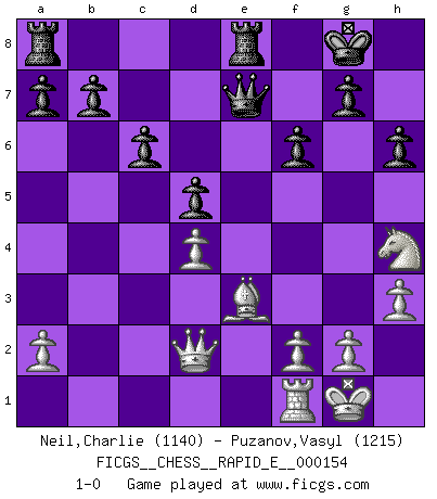 Last move : 1-0 2015 September 11 2:19:45 [Event "FICGS__CHESS__RAPID_E__000154"] [Site "FICGS"] [Date "2015.07.05"] [Round "1"] [White "Neil,Charlie"] [Black "Puzanov,Vasyl"] [Result "1-0"] [WhiteElo "1140"] [BlackElo "1215"] 1.e4 e5 2.Nf3 Nc6 3.Bc4 Bc5 4.b4 Bxb4 5.c3 Ba5 6.O-O Nf6 7.Qb3 O-O 8.Re1 Bb6 9.d4 Na5 10.Qa4 Nxc4 11.Qxc4 exd4 12.cxd4 d6 13.Bb2 Bg4 14.Nbd2 Re8 15.h3 Bxf3 16.Nxf3 Nxe4 17.Rad1 d5 18.Qd3 c6 19.Bc1 Qf6 20.Be3 h6 21.Ne5 Bc7 22.Nd7 Qd6 23.Ne5 f6 24.Nf3 Ba5 25.Rf1 Qe7 26.Nh4 Nc3 27.Rd2 Ne2+ 28.Qxe2 Bxd2 29.Qxd2 1-0 Evans gambit Kingside Castling by player White (move 6) Kingside Castling by player Black (move 7) Player White won this chess game. Follow this game move after move (download)Chess is a terrible game. If you have no center, your opponent has a freer position. If you do have a center, then you really have something to worry about ! (Siegbert Tarrasch) Die Idee von Capablanca, Schach als Fach in den Schulen zu lehren, ist großartig. (Fidel Castro) Yo creo que el Ajedrez posee una magia que es también una ayuda en la edad avanzada. Una rodilla reumática es olvidada durante una partida de Ajedrez y otros eventos pueden parecer algo sin importancia comparada a una catástrofe en el tablero de Ajedrez. (Vlastimil Hort) Le joueur d'Echecs qui veut atteindre le top est obligé de développer son propre credo créatif. Alexeï Stepanovicth Souétine. Il est facile d'écrire des livres ! Ce qui est difficile, c'est de jouer ! (Alexeï Stepanovicth Souétine) SEO proverb : Make your website optimized for human beings, not for search engines.