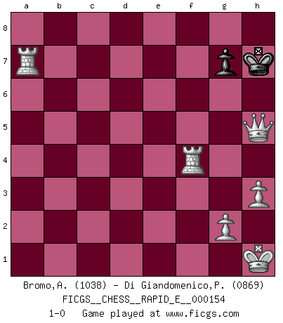 Last move : 1-0 2015 August 10 12:27:20 [Event "FICGS__CHESS__RAPID_E__000154"] [Site "FICGS"] [Date "2015.07.05"] [Round "1"] [White "Bromo,Alexis"] [Black "Di Giandomenico,Pierino"] [Result "1-0"] [WhiteElo "1038"] [BlackElo "0869"] 1.d4 d5 2.c4 Be6 3.Nc3 Nc6 4.e3 dxc4 5.Nf3 Nf6 6.h3 Bd5 7.Be2 e6 8.a3 Be7 9.Bd2 O-O 10.O-O Ne4 11.Nxe4 Bxe4 12.Bxc4 Na5 13.Bxa5 b6 14.Bb4 Bxb4 15.axb4 c5 16.bxc5 bxc5 17.Re1 cxd4 18.Nxd4 Qg5 19.f3 Bg6 20.Bxe6 fxe6 21.Nxe6 Qf6 22.Nxf8 Kxf8 23.Qd5 Qxb2 24.Qxa8+ Be8 25.Rxa7 Qd2 26.Rf1 Qxe3+ 27.Kh1 h5 28.f4 Qxf4 29.Rxf4+ Kg8 30.Qxe8+ Kh7 31.Qxh5+ 1-0 Queen's Gambit Kingside Castling by player Black (move 9) Kingside Castling by player White (move 10) 10 pieces endgame at move 29 : White KQRRPP , Black KBPP WHITE : King + 1 Queen 2 Rooks 2 Pawns BLACK : King + 1 Bishop 2 Pawns 9 pieces endgame at move 30 : White KQRRPP , Black KPP WHITE : King + 1 Queen 2 Rooks 2 Pawns BLACK : King + 2 Pawns 8 pieces endgame at move 31 : White KQRRPP , Black KP WHITE : King + 1 Queen 2 Rooks 2 Pawns BLACK : King + 1 Pawn Player White won this chess game. Follow this game move after move (download)Life is like a game of Chess, changing with each move. (Chinese proverb) Als ich elf wurde, wurde ich einfach gut. (Robert James Fischer) Fischer no está bajo la obligación de nadie. (Joseph Platz) Echiquier : carré parfait, comme la Jérusalem nouvelle décrite par l'auteur de l'Apocalypse, huit cases sur huit, exaltation du chiffre 4, symbole du cosmos aux quatre horizons... où le noir et le blanc, l'ombre et la lumière, le mal et le bien s'entremêlent et se conjuguent. (Robert Couffignal, Le Gambit du poète) God is an atheist. (Unknown)