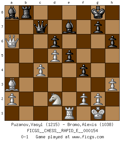 Last move : 0-1 2015 September 11 2:19:52 [Event "FICGS__CHESS__RAPID_E__000154"] [Site "FICGS"] [Date "2015.07.05"] [Round "1"] [White "Puzanov,Vasyl"] [Black "Bromo,Alexis"] [Result "0-1"] [WhiteElo "1215"] [BlackElo "1038"] 1.e4 e5 2.Nf3 Nc6 3.Bb5 d6 4.d4 Bd7 5.Bxc6 Bxc6 6.d5 Bb5 7.b3 h6 8.c4 Ba6 9.O-O Nf6 10.Re1 Be7 11.Bb2 O-O 12.Nc3 c6 13.h3 cxd5 14.Nxd5 Nxd5 15.exd5 b5 16.Qc2 f5 17.Nd2 Rc8 18.Ba3 bxc4 19.bxc4 f4 20.Qa4 Bb7 21.Qxa7 Qc7 22.Rab1 Ba8 23.Qa6 Rb8 24.Rxb8 Rxb8 0-1 Ruy Lopez : Old Steinitz defense Kingside Castling by player White (move 9) Kingside Castling by player Black (move 11) Player Black won this chess game. Follow this game move after move (download)I had a toothache during the first game. In the second game I had a headache. In the third game it was an attack of rheumatism. In the fourth game, I wasn't feeling well. And in the fifth game? Well, must one have to win every game ? (Siegbert Tarrasch) Drei Punkte vor allen anderen ist wie einer, der im weißen Anzug posiert, während der Rest in Müllsäcke gekleidet dasteht. (Viktor Kortschnoi) Ayuda a tus piezas para que ellas te puedan ayudar. (Paul Morphy) Le plus grand jeu de l'esprit jamais inventé, plus vous l'apprenez, plus vous y prenez du plaisir. (Garry Kasparov) How many people work in NATO Headquarters ? - About half of them. (Dirk Stikker, NATO general secretary)