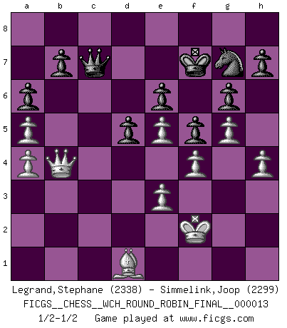 Last move : 1/2-1/2 2015 November 10 16:53:2 [Event "FICGS__CHESS__WCH_ROUND_ROBIN_FINAL__000013"] [Site "FICGS"] [Date "2015.07.07"] [Round "1"] [White "Legrand,Stephane"] [Black "Simmelink,Joop"] [Result "1/2-1/2"] [WhiteElo "2338"] [BlackElo "2299"] 1.d4 Nf6 2.c4 g6 3.g3 c6 4.Bg2 d5 5.cxd5 cxd5 6.Nc3 Bg7 7.Nf3 O-O 8.Ne5 e6 9.O-O Nfd7 10.f4 Nc6 11.Be3 Nb6 12.Bf2 Ne7 13.Rc1 Bd7 14.b3 f5 15.e3 Nbc8 16.Be1 Nd6 17.Rf2 Rc8 18.Rfc2 Nc6 19.Na4 Nxe5 20.dxe5 Bxa4 21.bxa4 Rxc2 22.Rxc2 Nc4 23.Qd4 a6 24.a5 Na3 25.Rc1 Qd7 26.Bb4 Nb5 27.Qb6 Rc8 28.Rxc8+ Qxc8 29.a4 Nc7 30.Bf3 Bf8 31.Bxf8 Kxf8 32.Qc5+ Kf7 33.h3 Qd7 34.g4 Ne8 35.Qb4 Ng7 36.g5 Ne8 37.Kf2 Qc6 38.h4 Ng7 39.Bd1 Qc7 1/2-1/2 King's Indian : 3.g3 Kingside Castling by player Black (move 7) Kingside Castling by player White (move 9) This chess game ended in a draw. Follow this game move after move (download)In order to improve your game, you must study the endgame before everything else, for whereas the endings can be studied and mastered by themselves, the middle game and the opening must be studied in relation to the endgame. (Jose Raul Capablanca) Zeige mir drei Eröffnungsvarianten und ich beweise dir, dass zwei davon inkorrekt sind. (Emanuel Lasker) Uno por uno, yo los acribillé, mi superioridad muy pronto se volvio aparente. (Jose Capablanca) Mais l'homme est une créature légère et illogique : semblable au joueur d'échecs, il n'aime que le processus du but à atteindre, non le but lui-même. (Dostoïevsky) The ego is not master in its own house. (Sigmund Freud)