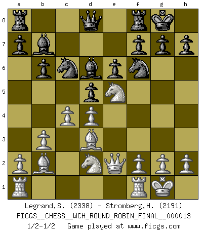 Last move : 1/2-1/2 2015 September 7 22:32:10 [Event "FICGS__CHESS__WCH_ROUND_ROBIN_FINAL__000013"] [Site "FICGS"] [Date "2015.07.07"] [Round "1"] [White "Legrand,Stephane"] [Black "Stromberg,Hakan"] [Result "1/2-1/2"] [WhiteElo "2338"] [BlackElo "2191"] 1.d4 d5 2.c4 c6 3.Nf3 Nf6 4.e3 e6 5.b3 c5 6.Bb2 cxd4 7.exd4 b6 8.Bd3 Bb7 9.O-O Bd6 10.Nbd2 O-O 11.Qe2 Nc6 12.Ne5 Nb4 13.Bb1 Nc6 14.Bd3 Nb4 15.Bb1 Nc6 16.Bd3 1/2-1/2 QGD Slav : 4.e3 Kingside Castling by player White (move 9) Kingside Castling by player Black (move 10) This chess game ended in a draw. Follow this game move after move (download)You know you're going to lose. Even when I was ahead I knew I was going to lose. - On playing against Fischer. (Andrew Soltis) Privat ist Kortschnoi kein schlechter Mensch, sehr sympathisch. Aber während des Spiels ist er grausam. Er will dich töten. (Miguel Najdorf) EL Ajedrez es como la vida. (Boris Spassky) Même si vous avez un bon coup à faire, regardez toujours s'il n'y en a pas un qui lui soit préférable. (Pedro Damiano) All the biggest technological inventions created by man - the airplane, the automobile, the computer - says little about his intelligence, but speaks volumes about his laziness. (Mark Kennedy)