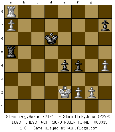 Last move : 1-0 2015 October 7 22:21:51 [Event "FICGS__CHESS__WCH_ROUND_ROBIN_FINAL__000013"] [Site "FICGS"] [Date "2015.07.07"] [Round "1"] [White "Stromberg,Hakan"] [Black "Simmelink,Joop"] [Result "1-0"] [WhiteElo "2191"] [BlackElo "2299"] 1.e4 e5 2.Nf3 Nc6 3.Bb5 a6 4.Ba4 Nf6 5.O-O Be7 6.Re1 b5 7.Bb3 O-O 8.a4 b4 9.d4 d6 10.dxe5 dxe5 11.Nbd2 Bc5 12.Qe2 Qe7 13.a5 Rd8 14.h3 Rb8 15.Nf1 Nd4 16.Nxd4 Bxd4 17.Bc4 Ra8 18.Nd2 Bb7 19.Bd3 Ba7 20.Nf3 Rd6 21.Bd2 Nh5 22.Kh2 Bc5 23.Be3 Bxe3 24.Qxe3 Nf4 25.Bf1 Ne6 26.Qb3 c5 27.c3 bxc3 28.bxc3 Rad8 29.Kg1 f6 30.Rab1 Bc8 31.Nh4 g6 32.Nf5 gxf5 33.exf5 Kh8 34.fxe6 Bxe6 35.Bc4 Qd7 36.Bxe6 Qxe6 37.Qb7 Qd5 38.Qe7 Re6 39.Qc7 Qd6 40.Qb7 Qd5 41.Re3 f5 42.R3e1 e4 43.Qf7 Red6 44.Rb7 Qxf7 45.Rxf7 Rd5 46.c4 R8d7 47.cxd5 Rxf7 48.Rc1 f4 49.Rxc5 Rf5 50.Kf1 Kg7 51.Ke2 Kf6 52.h4 Re5 53.Rc6+ Kf5 54.d6 Ke6 55.Rxa6 Rc5 56.Ra8 Kxd6 57.a6 Ra5 58.a7 1-0 Hakan Stromberg Thanks for the game Ruy Lopez : Closed, 7...O-O Kingside Castling by player White (move 5) Kingside Castling by player Black (move 7) Player White won this chess game. Follow this game move after move (download)Weak points or holes in the opponent's position must be occupied by pieces not Pawns. (Siegbert Tarrasch) Ich habe Putins Aufstieg an die Macht beobachtet und seine Politik, die demokratischen Institutionen meines Landes zu zerstören. (Garry Kasparov) Los finales de Peón son del Ajedrez lo que el cesped es del Golf. (Cecil Purdy) Celui qui prend des risques peut perdre, celui qui n'en prend pas perd toujours. (Xavier Tartacover) Sometimes it pays to stay in bed in Monday, rather than spending the rest of the week debugging Monday's code. (Dan Salomon)