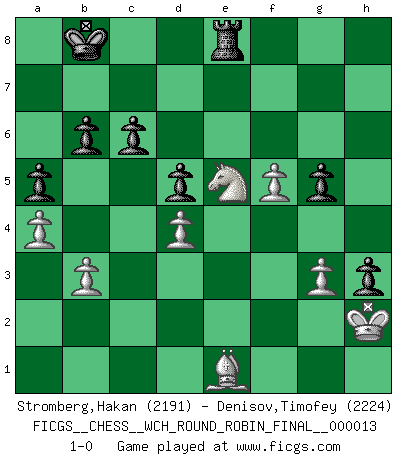 Last move : 1-0 2015 October 21 11:31:27 [Event "FICGS__CHESS__WCH_ROUND_ROBIN_FINAL__000013"] [Site "FICGS"] [Date "2015.07.07"] [Round "1"] [White "Stromberg,Hakan"] [Black "Denisov,Timofey"] [Result "1-0"] [WhiteElo "2191"] [BlackElo "2224"] 1.e4 c6 2.d4 d5 3.e5 Bf5 4.Nf3 e6 5.Be2 Nd7 6.O-O h6 7.a4 a5 8.b3 Ne7 9.Na3 Ng6 10.c3 Qb6 11.Ne1 h5 12.Nd3 Be7 13.Be3 h4 14.h3 Rc8 15.Bg4 Bxg4 16.hxg4 f6 17.exf6 gxf6 18.f4 h3 19.g3 Ngf8 20.Re1 Kf7 21.Kh2 Bd6 22.c4 Bb8 23.Nb1 Re8 24.Nd2 Qa6 25.Qf3 Ng6 26.Bf2 b6 27.cxd5 exd5 28.Rac1 Qb7 29.Rxe8 Kxe8 30.Re1+ Kd8 31.f5 Nh4 32.Qe2 Bd6 33.Qe6 Ng2 34.Qxd6 Nxe1 35.Bxe1 Qc7 36.Qe6 Re8 37.Nf4 Qc8 38.Qf7 Kc7 39.Ne6+ Kb8 40.Nf3 Nf8 41.Nxf8 Rxf8 42.Qe7 Qe8 43.Qxe8+ Rxe8 44.g5 fxg5 45.Ne5 1-0 Caro-Kann : Advance variation Kingside Castling by player White (move 6) Player White won this chess game. Follow this game move after move (download)Not only will I predict his triumph over Botvinnik, but I'll go further and say that he'll probably be the greatest Chess player that ever lived. (John Collins) Der beste Spieler in einem Turnier gewinnt es nie. Er landet auf Platz zwei oder drei. (Siegbert Tarrasch) Buenas posiciones no logran ganar juegos, buenas movidas sí. (Gerald Abrahams) Que feriez-vous si vous étiez en train de jouer aux échecs et que la fin du monde arrive ? Je continuerais à jouer. (Saint Borromée) Pushing plastic is for the many, pushing virtual pieces is for the fewer, pushing wood is for the very few. (Normajean Yates)