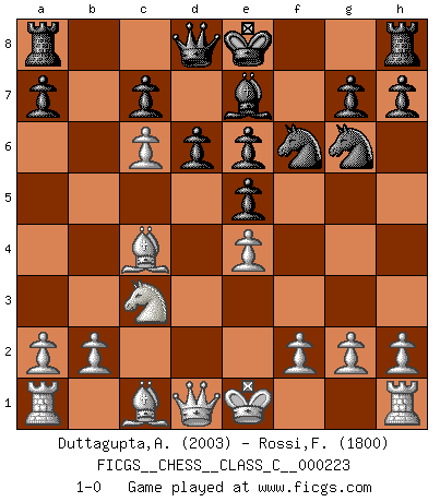 Last move : 1-0 2015 September 25 11:27:22 [Event "FICGS__CHESS__CLASS_C__000223"] [Site "FICGS"] [Date "2015.07.07"] [Round "1"] [White "Duttagupta,Aniruddha"] [Black "Rossi,Franco"] [Result "1-0"] [WhiteElo "2003"] [BlackElo "1800"] 1.c4 Nf6 2.Nc3 e6 3.e4 d6 4.d4 Nc6 5.Nf3 e5 6.d5 Ne7 7.c5 Ng6 8.Bb5+ Bd7 9.c6 bxc6 10.dxc6 Be6 11.Ng5 Be7 12.Nxe6 fxe6 13.Bc4 1-0 English : Mikenas-Carls variation Player White won this chess game. Follow this game move after move (download)Of Chess it has been said that life is not long enough for it, but that is the fault of life, not Chess. (William Ewart Napier) Offener Brief an US-Präsident Bush anlässlich der Verhaftung Bobby Fishers: Verhaften Sie mich. Stecken Sie mich in dieselbe Zelle wie Bobby Fisher und geben Sie uns ein Schachspiel mit. (Boris Vassilievich Spassky) Existen dos clases de sacrificios: los correctos y los míos. (Mikhail Tal) Votre prénom est 'Tactique', votre deuxième prénom est 'Tactique' et votre nom est 'Tactique'. (Ken Smith) Art is the only way to run away without leaving home. (Twyla Tharp)