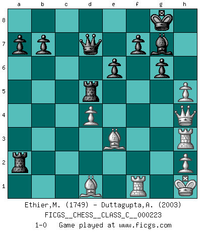 Last move : 1-0 2016 January 26 17:53:55 [Event "FICGS__CHESS__CLASS_C__000223"] [Site "FICGS"] [Date "2015.07.07"] [Round "1"] [White "Ethier,Marc"] [Black "Duttagupta,Aniruddha"] [Result "1-0"] [WhiteElo "1749"] [BlackElo "2003"] 1.e4 c6 2.d4 d5 3.e5 Bf5 4.Nf3 e6 5.Be2 c5 6.Be3 cxd4 7.Nxd4 Ne7 8.Nd2 Nbc6 9.N2f3 Be4 10.O-O Ng6 11.Ng5 Ngxe5 12.Nxe4 dxe4 13.c3 Bd6 14.Qc2 Nxd4 15.cxd4 Nd3 16.f3 Rc8 17.Qa4+ Rc6 18.Kh1 O-O 19.fxe4 Nxb2 20.Qb3 Rb6 21.Qc2 Qd7 22.e5 Rc8 23.Qe4 Bf8 24.Rf3 Nc4 25.Rh3 g6 26.Qh4 h5 27.Bg5 Bg7 28.Rf1 Nd6 29.exd6 Rxd6 30.Be3 Rd5 31.g4 Rc2 32.Bd1 Rxa2 33.gxh5 1-0 Caro-Kann : Advance variation Kingside Castling by player White (move 10) Kingside Castling by player Black (move 18) Player White won this chess game. Follow this game move after move (download)Winning isn't everything... but losing is nothing. (Mednis) Die Neutralität betrachte ich als eine schwere Krankheit. (Viktor Kortschnoi) Aquel que teme a un Peón de Reina aislado, debería de retirarse del Ajedrez. (Siegbert Tarrasch) Si le désir cupide (et stupide) de gagner est une inépuisable source de souffrance, une combinaison brillante sur l'échiquier est une découverte : le coquelicot qui s'épanouit lorsque apparaît la Voie Lactée. (Arrabal) Big Chess is a place for big hallucinations. (Thibault de Vassal)