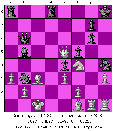 Last move : 1/2-1/2 2015 December 8 15:40:15 [Event "FICGS__CHESS__CLASS_C__000223"] [Site "FICGS"] [Date "2015.07.07"] [Round "1"] [White "Domingo,Jordi"] [Black "Duttagupta,Aniruddha"] [Result "1/2-1/2"] [WhiteElo "1712"] [BlackElo "2003"] 1.g4 d5 2.Bg2 c6 3.h3 e5 4.d4 e4 5.c4 Bd6 6.Nc3 Ne7 7.Bg5 f6 8.Bd2 O-O 9.Qb3 Kh8 10.e3 a5 11.Nge2 a4 12.Qc2 f5 13.a3 Ng6 14.O-O-O Nh4 15.Rdg1 Na6 16.c5 Bc7 17.g5 b5 18.cxb6 Bxb6 19.Nxa4 Bd7 20.Nxb6 Qxb6 21.Bc3 c5 22.Qd2 Bb5 23.Nf4 Qb7 24.g6 hxg6 25.dxc5 Nxc5 26.Qxd5 Qb6 27.Bf1 Rfd8 28.Qe5 Nb3+ 29.Kc2 Na1+ 30.Kc1 Nb3+ 1/2-1/2 Grob's attack Kingside Castling by player Black (move 8) Queenside Castling by player White (move 14) This chess game ended in a draw. Follow this game move after move (download)Chess is a part of culture and if a culture is declining then Chess too will decline. (Mikhail Botvinnik) Ich habe Putins Aufstieg an die Macht beobachtet und seine Politik, die demokratischen Institutionen meines Landes zu zerstören. (Garry Kasparov) Juega la Apertura como un libro, el Juego Medio como un mago y los Finales como una máquina. (Spielmann) Avec des compensations pour le matériel en plus... (Anonyme) Only sick music makes money today. (Friedrich Nietzsche)