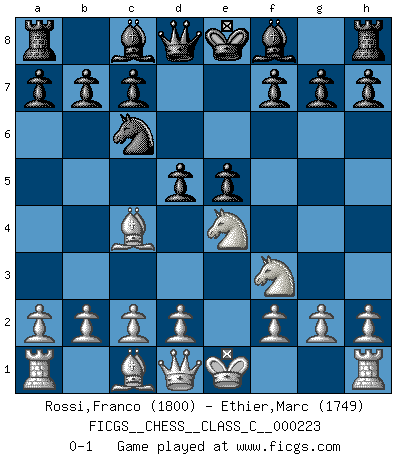 Last move : 0-1 2015 August 23 9:25:47 [Event "FICGS__CHESS__CLASS_C__000223"] [Site "FICGS"] [Date "2015.07.07"] [Round "1"] [White "Rossi,Franco"] [Black "Ethier,Marc"] [Result "0-1"] [WhiteElo "1800"] [BlackElo "1749"] 1.e4 e5 2.Bc4 Nf6 3.Nc3 Nc6 4.Nf3 Nxe4 5.Nxe4 d5 0-1 This chess game has been lost on time (started : 2015.07.07 20:24:3) Bishop's Opening : Berlin defense Player Black won this chess game. Follow this game move after move (download)Let the perfectionist play postal. (Yasser Seirawan) Weshalb minderdergeübte Spieler mit g2-g4 beginnen? Die betreffenden sind unschlüssig, ob sie nun rechts (h4) oder links (f4) beginnen sollen, und in ihrer Ratlosigkeit entschliessen sie sich nach guter Bürgerart dazu, den goldenen Mittelweg zu wählen. (Aaron Nimzowitsch) Tu cuerpo tiene que estar en óptima condición. Tu Ajedrez se deteriora como lo hace tu cuerpo. No puedes separar la mente y el cuerpo. (Bobby Fischer) L'action d'une oeuvre littéraire se déroule sur un champ de bataille. Les masques et les types du drame moderne correspondent aux pièces du jeu d'échecs. L'intrigue correspond aux coups et aux gambits, c'est à dire aux techniques du jeu telles qu'utilisées et interprétées par les joueurs. Les tactiques et les péripéties [mouvements] correspondent aux coups exécutés par l'adversaire. (Viktor Shklovsky) It's not the will to win, but the will to prepare to win that makes the difference. (Bear Bryant)
