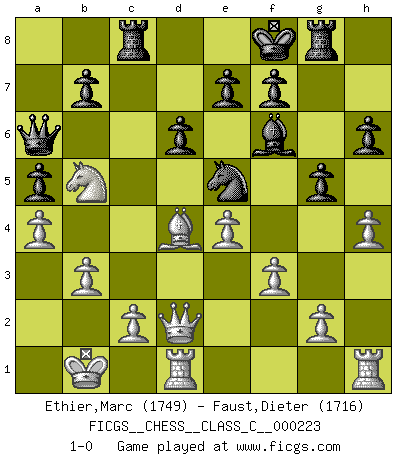 Last move : 1-0 2015 October 8 14:19:26 [Event "FICGS__CHESS__CLASS_C__000223"] [Site "FICGS"] [Date "2015.07.07"] [Round "1"] [White "Ethier,Marc"] [Black "Faust,Dieter"] [Result "1-0"] [WhiteElo "1749"] [BlackElo "1716"] 1.e4 c5 2.Nf3 d6 3.d4 cxd4 4.Nxd4 Nf6 5.Nc3 Nc6 6.Bg5 Qb6 7.Nb3 Ng4 8.Qd2 h6 9.Nd5 Qd8 10.Bh4 g5 11.Bg3 Bg7 12.O-O-O a5 13.a4 Nf6 14.Nxf6+ Bxf6 15.Bb5 Bd7 16.Kb1 Ne5 17.Nd4 Bxb5 18.Nxb5 Qb6 19.b3 Rc8 20.f3 Rg8 21.Bf2 Qa6 22.Bd4 Kf8 23.h4 1-0 Sicilian : Richter-Rauzer Queenside Castling by player White (move 12) Player White won this chess game. Follow this game move after move (download)Whoever sees no other aim in the game than that of giving checkmate to one's opponent will never become a good Chess player. (Euwe) Ich liebe den Moment, wenn ich das Ego meines Gegenüber breche. (Robert James Fischer) Fischer es el jugador mas fuerte del mundo. De hecho, el jugador mas fuerte que jamas haya existido. (Larry Evans) Echiquier : carré parfait, comme la Jérusalem nouvelle décrite par l'auteur de l'Apocalypse, huit cases sur huit, exaltation du chiffre 4, symbole du cosmos aux quatre horizons... où le noir et le blanc, l'ombre et la lumière, le mal et le bien s'entremêlent et se conjuguent. (Robert Couffignal, Le Gambit du poète) To steal ideas from one person is plagiarism. To steal from many is research. (Unknown)