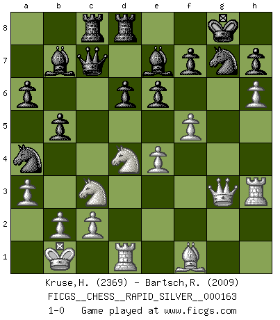 Last move : 1-0 2015 July 13 9:12:22 [Event "FICGS__CHESS__RAPID_SILVER__000163"] [Site "FICGS"] [Date "2015.07.08"] [Round "1"] [White "Kruse,Herbert"] [Black "Bartsch,Reinhard Andrea"] [Result "1-0"] [WhiteElo "2369"] [BlackElo "2009"] 1.e4 c5 2.Nf3 d6 3.d4 cxd4 4.Nxd4 Nf6 5.Nc3 a6 6.f3 e6 7.Be3 b5 8.a3 Bb7 9.Qd2 Nbd7 10.O-O-O Ne5 11.Qe1 Be7 12.g4 Nfd7 13.h4 Nb6 14.Kb1 Rc8 15.Bc1 Qc7 16.Rh3 O-O 17.h5 Rfd8 18.f4 Nxg4 19.Qg3 Nf6 20.f5 Na4 21.Bh6 Ne8 22.Bxg7 Nxg7 23.h6 1-0 Sicilian : Najdorf Queenside Castling by player White (move 10) Kingside Castling by player Black (move 16) Player White won this chess game. Follow this game move after move (download)A good sacrifice is one that is not necessarily sound but leaves your opponent dazed and confused. (Rudolph Spielmann) Ein Buch ist ein Spiegel; wenn ein Affe hineinsieht, so kann kein Apostel heraus gucken. (Georg Christoph Lichtenberg) Prefiero perder una partida realmente buena, que ganar una mala. (David Levy) Toutes les manuvres exécutées sur une colonne ouverte ont pour but ultime l'intrusion définitive sur la septième ou la huitième rangée, en plein cur de la position ennemie. (Aaron Nimzovitch) Lamb in skin of tiger, still fears the wolf. (Chinese proverb)