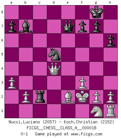 Last move : 0-1 2007 March 20 9:31:7 [Event "FICGS__CHESS__CLASS_A__000018"] [Site "FICGS"] [Date "2007.03.07"] [Round "1"] [White "Nucci,Luciano"] [Black "Koch,Christian"] [Result "0-1"] [WhiteElo "2057"] [BlackElo "2152"] 1.d4 Nf6 2.c4 e6 3.Nc3 Bb4 4.Qc2 O-O 5.a3 Bxc3+ 6.Qxc3 b6 7.Bg5 Bb7 8.f3 h6 9.Bh4 d5 10.cxd5 exd5 11.Bf2 Qe7 12.Rc1 Rc8 13.e3 c5 14.Qd2 Nc6 15.dxc5 bxc5 16.Be2 d4 17.exd4 Nxd4 18.Bxd4 cxd4 19.Rxc8+ Rxc8 20.Kf2 Nd5 21.Qxd4 Rc2 0-1 Nimzo-Indian : Classical variation Kingside Castling by player Black (move 4) Player Black won this chess game. Follow this game move after move (download)Via the squares on the chessboard, the Indians explain the movement of time and the age, the higher influences which control the world and the ties which link Chess with the human soul. (Al-Masudi) Ein Teil des Fehlers ist immer korrekt. (Savielly Grigorievitsch Tartakower) Si el Ajedrez es una ciencia, es la mas inexacta. Si el Ajedrez es un arte, es demasiado inexacto para ser visto como tal. Si el Ajedrez es un deporte, es demasiado esotérico. Si el Ajedrez es un juego, es demasiado exigente para ser solo un juego. Si el Ajedrez es una aventura, es una muy demandante. Si el Ajedrez es una pasión, es una muy gratificante. Si el Ajedrez es la vida, es una muy triste. (Anónimo) Le profane ne songe pas à la somme de jouissance dont il se prive, qui méconnaît ce jeu aux ressources aussi variées que passionnantes. (Jean-Marie Jeanton-Lamarche) Men never do evil so completely and cheerfully as when they do it from religious conviction. (Blaise Pascal)