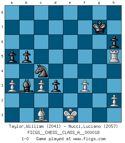 Last move : 1-0 2007 December 12 17:45:45 [Event "FICGS__CHESS__CLASS_A__000018"] [Site "FICGS"] [Date "2007.03.07"] [Round "1"] [White "Taylor,William"] [Black "Nucci,Luciano"] [Result "1-0"] [WhiteElo "2041"] [BlackElo "2057"] 1.e4 e6 2.d4 d5 3.Nc3 Bb4 4.e5 c5 5.a3 Bxc3+ 6.bxc3 Qc7 7.Nf3 b6 8.Bb5+ Bd7 9.Bd3 Ba4 10.O-O Ne7 11.Ng5 h6 12.Qh5 g6 13.Qh4 Nd7 14.Ra2 c4 15.Be2 Nf5 16.Qh3 b5 17.Bd2 Kf8 18.Nf3 Kg7 19.Nh4 Rae8 20.Nxf5+ exf5 21.g4 f6 22.gxf5 fxe5 23.Qg3 Nf8 24.Bh5 Rg8 25.Kh1 Qf7 26.fxg6 Qf5 27.Bg4 Qe4+ 28.Bf3 Qf5 29.Bxd5 exd4 30.Qc7+ Nd7 31.Bxg8 Qf3+ 32.Kg1 Rxg8 33.Qg3 Qf5 34.f3 Kh8 35.Kf2 Rxg6 36.Qf4 Qxf4 37.Bxf4 d3 38.cxd3 cxd3 39.R2a1 Nb6 40.Rg1 Kh7 41.Rxg6 Kxg6 42.Rg1+ Kh7 43.Ke1 Nc4 44.Bc1 Bb3 45.Rg3 a5 46.Rh3 Kg7 47.Rh5 1-0 French : Winawer, Classical variation Kingside Castling by player White (move 10) Player White won this chess game. Follow this game move after move (download)Chess is a sea in which a gnat may drink and an elephant may bathe. (Hindu proverb) Alles was ich jemals tun will ist Schach spielen. (Robert James Fischer) Te sientas frente a un tablero y repentinamente tu corazón brinca. Tu mano tiembla al tomar una pieza y moverla. Pero lo que el Ajedrez te enseña es que tu debes permanecer ahí con calma y pensar de que si realmente es una buena idea o de que si hay otras ideas mejores. (Stanley Kubrick) Psychologiquement, tu dois avoir confiance en toi même, mais cette confiance doit être basée sur des faits. (Robert Fischer) The general who wins the battle makes many calculations in his temple before the battle is fought. The general who loses makes but few calculations beforehand. (Sun Tzu)