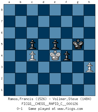 Last move : 0-1 2015 July 25 17:17:3 [Event "FICGS__CHESS__RAPID_C__000126"] [Site "FICGS"] [Date "2015.07.10"] [Round "1"] [White "Ramos,Francis"] [Black "Vollmer,Steve"] [Result "0-1"] [WhiteElo "1526"] [BlackElo "1484"] 1.e4 Nf6 2.Nc3 d6 3.d4 g6 4.Be3 Bg7 5.f3 Nbd7 6.Qd2 O-O 7.Bd3 b6 8.Nge2 Bb7 9.O-O c6 10.Rad1 Qc7 11.Bf4 e5 12.dxe5 dxe5 13.Bh6 Rad8 14.Bxg7 Kxg7 15.f4 Nc5 16.Qe3 Nxd3 17.Rxd3 Ba6 18.Rxd8 Rxd8 19.f5 Qd6 20.fxg6 hxg6 21.h3 Bxe2 22.Qxe2 Qd2 23.Qxd2 Rxd2 24.Rf2 Rd4 25.Re2 b5 26.a3 a5 27.Kf2 b4 28.axb4 axb4 29.Na4 Nxe4+ 30.Ke3 f5 31.c3 bxc3 32.Nxc3 Nxc3 33.bxc3 Re4+ 34.Kd3 Rxe2 35.Kxe2 Kf6 36.g3 g5 37.Ke3 c5 38.c4 f4+ 39.gxf4 gxf4+ 40.Ke4 Kg5 0-1 Alekhine's defense Kingside Castling by player Black (move 6) Kingside Castling by player White (move 9) 10 pieces endgame at move 34 : White KPPP , Black KRPPPP WHITE : King + 3 Pawns BLACK : King + 1 Rook 4 Pawns 9 pieces endgame at move 35 : White KPPP , Black KPPPP WHITE : King + 3 Pawns BLACK : King + 4 Pawns 8 pieces endgame at move 39 : White KPPP , Black KPPP WHITE : King + 3 Pawns BLACK : King + 3 Pawns 7 pieces endgame at move 39 : White KPP , Black KPPP WHITE : King + 2 Pawns BLACK : King + 3 Pawns Player Black won this chess game. Follow this game move after move (download)Bobby Fischer is the greatest Chess player who has ever lived. (Ken Smith) Es gibt Leute, die glauben, alles wäre vernünftig, was man mit einem ernsthaften Gesicht tut. (Georg Christoph Lichtenberg) El Ajedrez es una manera fabulosa para que los niños aprendan a autovalorarse y a autoestimarse. (Saudin Robovic) Même un GMI sait rarement calculer sur plus de cinq coups une attaque à sacrifices. (Rudolf Spielmann) There's always a bigger fish. (Qui-Gon Jinn in Star Wars ep.1)