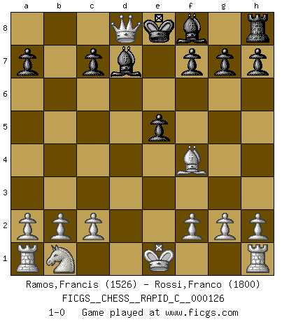 Last move : 1-0 2015 August 26 9:43:27 [Event "FICGS__CHESS__RAPID_C__000126"] [Site "FICGS"] [Date "2015.07.10"] [Round "1"] [White "Ramos,Francis"] [Black "Rossi,Franco"] [Result "1-0"] [WhiteElo "1526"] [BlackElo "1800"] 1.e4 e5 2.Nf3 Nf6 3.d4 exd4 4.e5 Qe7 5.Qxd4 Nc6 6.Qc3 Ng4 7.Bf4 Ngxe5 8.Nxe5 d6 9.Bb5 dxe5 10.Bxc6+ bxc6 11.Qxc6+ Bd7 12.Qxa8+ Qd8 13.Qxd8+ 1-0 This chess game has been lost on time (started : 2015.07.10 0:59:27) Petrov : Modern (Steinitz) attack Player White won this chess game. Follow this game move after move (download)You have to have the fighting spirit. You have to force moves and take chances. (Bobby Fischer) Ein Isolani verdüstert die Stimmung auf dem ganzen Schachbrett. (Savielly Grigorievitsch Tartakower) El Ajedrez es 99 por ciento táctica. (Teichmann) Dans le domaine de la peinture, de la gravure et de la sculpture, dès la première décennie de notre siècle, les artistes abandonnent la représentation de la partie d'échecs pour se concentrer sur les pièces, sur les échiquiers et sur toutes les variations auxquelles les unes et les autres peuvent donner lieu. On passe en quelque sorte d'un thème social à un thème musical (au sens de la musica médiévale, c'est-à-dire d'une notion qui inclue le rythme, l'harmonie, la construction et la déconstruction, etc.). Graphiquement et picturalement, l'échiquier apparaît comme une structure ouverte, dynamique, d'une richesse infinie, autorisant toutes les combinatoires et débouchant sur des mouvements et des rythmes de nature exponentielle. (Michel Pastoureau) The mind is like a parachute, it only functions when its open. (Unknown)