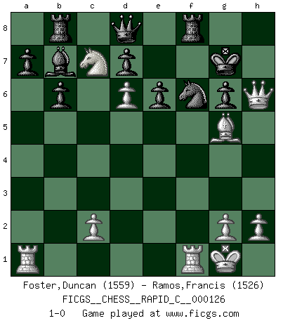 Last move : 1-0 2015 July 25 13:55:21 [Event "FICGS__CHESS__RAPID_C__000126"] [Site "FICGS"] [Date "2015.07.10"] [Round "1"] [White "Foster,Duncan"] [Black "Ramos,Francis"] [Result "1-0"] [WhiteElo "1559"] [BlackElo "1526"] 1.e4 c5 2.a3 Nc6 3.b4 cxb4 4.axb4 Nxb4 5.d4 Nc6 6.d5 Nb8 7.e5 f6 8.Nf3 g6 9.Bd3 e6 10.Nc3 Bg7 11.d6 fxe5 12.Ng5 Bf6 13.Nge4 Nc6 14.Nb5 Kf7 15.O-O Nd4 16.Nc7 Rb8 17.f4 exf4 18.Nxf6 Nxf6 19.Bxf4 Kg7 20.Bxg6 hxg6 21.Qxd4 Rf8 22.Bg5 b6 23.Qh4 Bb7 24.Qh6+ 1-0 Sicilian defense Kingside Castling by player White (move 15) Player White won this chess game. Follow this game move after move (download)Half the variations which are calculated in a tournament game turn out to be completely superfluous. Unfortunately, no one knows in advance which half. (Jan Tinman) Ein guter Spieler hat immer Glück. (José Raúl Capablanca) Tu sabes, camarada Pachman, no disfruto el ser un Ministro, preferería jugar al Ajedrez como tu. (Che Guevara) En blitz, le Cavalier l'emporte sur le Fou. (Vlastimil Hort) Question: Is 'This statement is paradoxical' a paradoxical statement ? Or is it a meta-paradox ? (Normajean Yates)
