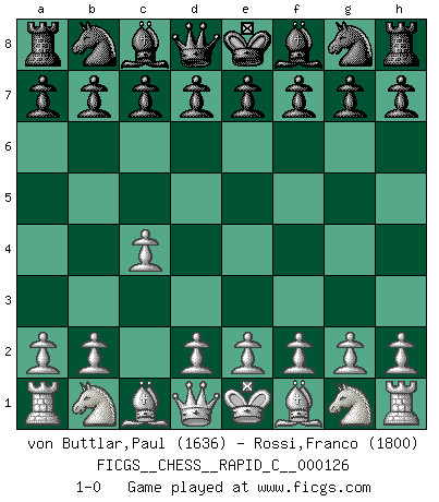 Last move : 1-0 2015 September 3 22:20:8 [Event "FICGS__CHESS__RAPID_C__000126"] [Site "FICGS"] [Date "2015.07.10"] [Round "1"] [White "von Buttlar,Paul"] [Black "Rossi,Franco"] [Result "1-0"] [WhiteElo "1636"] [BlackElo "1800"] 1.c4 1-0 This chess game has been lost on time (started : 2015.07.10 0:59:27) English Opening Player White won this chess game. Follow this game move after move (download)Fischer prefers to enter Chess history alone. (Miguel Najdorf) Über Frauen: Chess is better. (Robert James Fischer) De todos mis libros Rusos, la defensa contiene y difunde el 'calor' mas grande que pudiese verse extraño al observar lo supremamente abstracto que el Ajedrez supuestamente es. (Vladimir Nabokov) On est toujours la mazette de quelqu'un d'autre. (Anonyme) It's not a bug - it's an undocumented feature. (Anonymous)