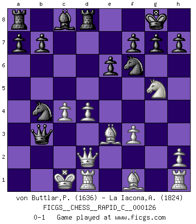 Last move : 0-1 2015 August 20 22:0:31 [Event "FICGS__CHESS__RAPID_C__000126"] [Site "FICGS"] [Date "2015.07.10"] [Round "1"] [White "von Buttlar,Paul"] [Black "La Iacona,Alessandro"] [Result "0-1"] [WhiteElo "1636"] [BlackElo "1824"] 1.c4 Nf6 2.Nc3 e6 3.e4 d5 4.d4 dxe4 5.f3 Bb4 6.a3 Bxc3+ 7.bxc3 c5 8.Be3 Qa5 9.Qd2 Nc6 10.Nh3 O-O 11.Ng5 exf3 12.gxf3 Rd8 13.O-O-O cxd4 14.cxd4 Qxa3+ 15.Kb1 Qb3+ 16.Kc1 Nb4 0-1 English : Mikenas-Carls variation Kingside Castling by player Black (move 10) Queenside Castling by player White (move 13) Player Black won this chess game. Follow this game move after move (download)When you are lonely, when you feel yourself an alien in the world, play Chess. This will raise your spirits and be your counselor in war. (Aristotle) Wenn Du einsam bist, wenn Du Dich in der Welt wie ein Fremder fühlst, spiele Schach. Das wird Deinen Geist erheben und Dein Ratgeber im Kampf sein. (Aristoteles) El Ajedrez es tan interesante por sí solo, que no es necesario un interés monetario para persuadir a una persona a que lo practique; por lo tanto, nunca se juega por dinero. (Benjamin Franklin) On peut tirer plus d'utilité d'une partie perdue que de 100 parties gagnées. (Capablanca) The question of whether computers can think is just like question of whether submarines can swim. (Edsger W. Dijkstra)