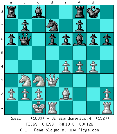 Last move : 0-1 2015 August 25 9:32:36 [Event "FICGS__CHESS__RAPID_C__000126"] [Site "FICGS"] [Date "2015.07.10"] [Round "1"] [White "Rossi,Franco"] [Black "Di Giandomenico,Alfonso"] [Result "0-1"] [WhiteElo "1800"] [BlackElo "1527"] 1.e4 c5 2.Nf3 d6 3.d4 cxd4 4.Nxd4 Nf6 5.Nc3 g6 6.Bg5 Bg7 7.f4 h6 8.Bxf6 Bxf6 9.Be2 Qb6 10.Nb3 e6 11.Qd3 a6 12.O-O-O O-O 13.g4 Nd7 0-1 This chess game has been lost on time (started : 2015.07.10 0:59:27) Sicilian : Dragon variation Queenside Castling by player White (move 12) Kingside Castling by player Black (move 12) Player Black won this chess game. Follow this game move after move (download)It was clear to me that the vulnerable point of the American Grandmaster (Bobby Fischer) was in double-edged, hanging, irrational positions, where he often failed to find a win even in a won position. (Efim Geller) Ich trinke, ich rauche, ich spiele, ich liebe Frauen aber Fernschach ist ein Laster, das ich nicht habe. (Mikhail Nekhemyevich Tal) El pensamiento metódico es mas útil en el Ajedrez que la inspiración. (C. J. S. Purdy) D'abord les bases : Jouez et étudiez, puis étudiez et jouez, ensuite jouez et étudiez, puis étudiez et jouez. Deuxièmement : Donnez toujours le meilleur de vous-même ! (Ken Smith) Work expands to fill the time available. (C. Northcote Parkinson, in Parkinson's Laws)