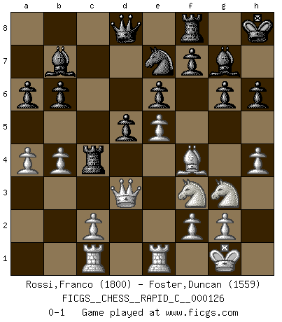 Last move : 0-1 2015 August 29 21:58:21 [Event "FICGS__CHESS__RAPID_C__000126"] [Site "FICGS"] [Date "2015.07.10"] [Round "1"] [White "Rossi,Franco"] [Black "Foster,Duncan"] [Result "0-1"] [WhiteElo "1800"] [BlackElo "1559"] 1.d4 b6 2.e4 Bb7 3.Nc3 e6 4.Nf3 h6 5.Bc4 g6 6.O-O Bg7 7.Re1 Ne7 8.Bf4 d6 9.e5 d5 10.Bd3 a6 11.Ne2 O-O 12.Ng3 Nd7 13.h4 Kh8 14.Rc1 c5 15.dxc5 Nxc5 16.b4 Nxd3 17.Qxd3 Rc8 18.a4 Rc4 0-1 This chess game has been lost on time (started : 2015.07.10 0:59:27) Queen's pawn : English defense Kingside Castling by player White (move 6) Kingside Castling by player Black (move 11) Player Black won this chess game. Follow this game move after move (download)A chess genius has died; a loss for humanity. (Viktor Kortchnoi, about Bobby Fischer's death) Ich bin der einzige Schachspieler, der sich während der Vorbereitungen zum Turnier verletzt hat. (Woody Allen) Preferería tener un Peón que un dedo. (Reuben Fine) Karpov est une pièce de musée. (Garry Kasparov) It is the aim of the modern school, not to treat every position according to one general law, but according to the principle inherent in the position. (Richard Reti)