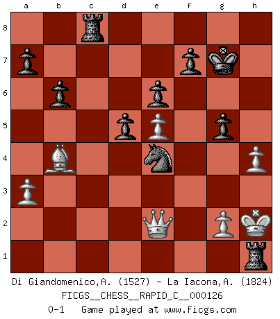 Last move : 0-1 2015 September 16 8:23:0 [Event "FICGS__CHESS__RAPID_C__000126"] [Site "FICGS"] [Date "2015.07.10"] [Round "1"] [White "Di Giandomenico,Alfonso"] [Black "La Iacona,Alessandro"] [Result "0-1"] [WhiteElo "1527"] [BlackElo "1824"] 1.e4 c6 2.d4 d5 3.e5 Bf5 4.Nf3 e6 5.Nc3 Bb4 6.a3 Bxc3+ 7.bxc3 Ne7 8.Bg5 Nd7 9.Bd3 Bxd3 10.Qxd3 O-O 11.O-O h6 12.Bh4 c5 13.h3 Rc8 14.Nh2 g5 15.Bg3 Nf5 16.Ng4 cxd4 17.cxd4 Qc7 18.Ne3 Nxe3 19.Qxe3 Qc3 20.Qe2 Qxd4 21.Rad1 Qc3 22.Qh5 Kg7 23.Rd3 Qxc2 24.Rfd1 Nc5 25.R1d2 Qc1+ 26.Rd1 Nxd3 27.Rxc1 Rxc1+ 28.Kh2 Nc5 29.f3 b6 30.h4 Rh8 31.Qg4 Rc4 32.f4 Ne4 33.fxg5 hxg5 34.Be1 Rc1 35.Qe2 Rhc8 36.Bb4 Rh1+ 0-1 Caro-Kann : Advance variation Kingside Castling by player Black (move 10) Kingside Castling by player White (move 11) Player Black won this chess game. Follow this game move after move (download)I'm not afraid of Spassky. The world knows I'm the best. You don't need a match to prove it. (Bobby Fischer) Ich kämpfe solange mein Gegner einen Fehler machen kann. (Emanuel Lasker) Puntos débiles o agujeros en la posición de tu oponente deben de ser ocupados por piezas, no Peones. (Siegbert Tarrasch) Il n'y a pas de prix trop élevé au scalp de l'ennemi. (Koblentz) The message for business people contemplating their place in the cyberspace is simple and direct: get linked or get lost. (Vic Sussman and Kenan Pollack)