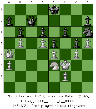 Last move : 1/2-1/2 2007 May 7 13:25:51 [Event "FICGS__CHESS__CLASS_A__000018"] [Site "FICGS"] [Date "2007.03.07"] [Round "1"] [White "Nucci,Luciano"] [Black "Markus,Roland"] [Result "1/2-1/2"] [WhiteElo "2057"] [BlackElo "2165"] 1.d4 Nf6 2.c4 Nc6 3.Nf3 e6 4.Nc3 Bb4 5.Qc2 d6 6.Bd2 O-O 7.a3 Bxc3 8.Bxc3 Qe7 9.e3 e5 10.d5 Nb8 11.Nd2 c6 12.e4 cxd5 13.cxd5 b6 14.Rc1 Ba6 15.Bxa6 Nxa6 16.O-O Nh5 17.Nc4 Rac8 18.Ne3 g6 19.b4 Nf4 20.Qd2 f6 21.g3 Nh3+ 22.Kg2 Ng5 23.Qd3 Nb8 24.h4 Nf7 25.Bd2 Nh6 26.h5 g5 27.Rxc8 Rxc8 28.Rc1 Rxc1 29.Bxc1 Qd7 30.b5 Qd8 31.Bd2 Nd7 32.Bb4 Qc7 33.Qc4 Nc5 34.Bxc5 Qxc5 35.Qa4 Qc7 36.Kf3 Kf8 37.g4 Ke8 1/2-1/2 Kevitz-Trajkovich defense Kingside Castling by player Black (move 6) Kingside Castling by player White (move 16) This chess game ended in a draw. Follow this game move after move (download)Best by test: 1. e4 (Bobby Fischer) Gegen einen Schachcomputer zu verlieren ist wie Löcher in den Strümpfen zuhaben. Es ist nicht peinlich, solange man der einzige ist der es weiß. (Anonymous) Debemos de asegurarnos de que el Ajedrez no se convierta en un lenguaje muerto, muy interesante, pero tan solo para un grupo muy pequeño. (Sytze Faber) Vouloir jouer aux échecs contre soi-même est aussi paradoxal que vouloir marcher sur son ombre. (Stefan Zweig) Now you put water in a cup, it becomes the cup; You put water into a bottle it becomes the bottle; You put it in a teapot it becomes the teapot. Water can flow or it can crash. Be water, my friend. (Bruce Lee)