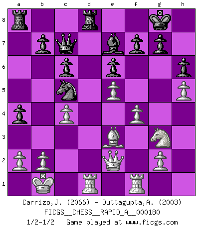Last move : 1/2-1/2 2015 September 17 22:14:7 [Event "FICGS__CHESS__RAPID_A__000180"] [Site "FICGS"] [Date "2015.07.13"] [Round "1"] [White "Carrizo,Jose"] [Black "Duttagupta,Aniruddha"] [Result "1/2-1/2"] [WhiteElo "2066"] [BlackElo "2003"] 1.e4 c6 2.d4 d5 3.Nc3 dxe4 4.Nxe4 Bf5 5.Ng3 Bg6 6.h4 h6 7.Nf3 Nd7 8.h5 Bh7 9.Bd3 Bxd3 10.Qxd3 e6 11.Bf4 Qa5+ 12.Bd2 Bb4 13.c3 Be7 14.c4 Qc7 15.O-O-O Ngf6 16.Kb1 O-O 17.Rhe1 a5 18.Ne5 Nxe5 19.dxe5 Rfd8 20.Qe2 Nd7 21.f4 Nc5 22.Be3 a4 23.Rf1 1/2-1/2 Caro-Kann : Classical, 7...Nd7 Queenside Castling by player White (move 15) Kingside Castling by player Black (move 16) This chess game ended in a draw. Follow this game move after move (download)All I want to do, ever, is just play Chess. (Bobby Fischer) Ich trinke, ich rauche, ich spiele, ich liebe Frauen aber Fernschach ist ein Laster, das ich nicht habe. (Mikhail Nekhemyevich Tal) Si un gobernante no entiende al Ajedrez, ¿como puede governar él un reinado?. (El Rey Khusros II) Je crois qu'il existe des manières très spécifiques de jouer efficacement contre une machine. Evidemment, nous n'avons aucune chance en technique pure, parce que l'ordinateur calcule de manière parfaite. Mais lorsque nous faisons appel à notre cerveau, en utilisant l'intuition et la compréhension, alors nous restons beaucoup plus forts. (Anatoli Karpov) Statistics can be made to prove anything - even the truth. (Author unknown)
