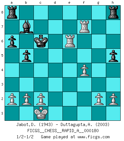 Last move : 1/2-1/2 2015 August 23 17:32:40 [Event "FICGS__CHESS__RAPID_A__000180"] [Site "FICGS"] [Date "2015.07.13"] [Round "1"] [White "Jabot,Daniel"] [Black "Duttagupta,Aniruddha"] [Result "1/2-1/2"] [WhiteElo "1943"] [BlackElo "2003"] 1.e4 c5 2.Nf3 d6 3.d4 cxd4 4.Nxd4 Nf6 5.Nc3 a6 6.Bg5 e6 7.f4 Nbd7 8.Qf3 Qc7 9.O-O-O b5 10.Bd3 Bb7 11.Rhe1 Qb6 12.Nd5 exd5 13.Nc6 dxe4 14.Bxe4 Nc5 15.Bxf6 gxf6 16.Qh3 Ne6 17.Bg6 Kd7 18.Bxf7 Kxc6 19.Qxe6 Qd8 20.Qe3 Qd7 21.Qc3+ Kb6 22.Qxf6 h5 23.Be6 Bg7 24.Bxd7 Bxf6 25.Rxd6+ Kc7 26.Rxf6 Kxd7 27.Rf7+ Kc6 28.Re6+ Kd5 29.Re5+ Kc6 30.Re6+ 1/2-1/2 Sicilian : Najdorf, 7.f4 Queenside Castling by player White (move 9) This chess game ended in a draw. Follow this game move after move (download)In Chess, as it is played by masters, chance is practically eliminated. (Emanuel Lasker) Privat ist Kortschnoi kein schlechter Mensch, sehr sympathisch. Aber während des Spiels ist er grausam. Er will dich töten. (Miguel Najdorf) No nos podemos resistir a la fascinación de un sacrificio ya que la pasión por los sacrificios es parte de la naturaleza de un jugador de Ajedrez. (Rudolf Spielman) Aux échecs, l'amour-propre est satisfait quand on remporte la victoire, mais il n'y a pas de honte à être battu. (Benjamin Franklin) You think that education is too expensive ? Try ignorance. (Derek Bok)