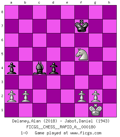 Last move : 1-0 2015 October 24 13:29:49 [Event "FICGS__CHESS__RAPID_A__000180"] [Site "FICGS"] [Date "2015.07.13"] [Round "1"] [White "Delaney,Alan"] [Black "Jabot,Daniel"] [Result "1-0"] [WhiteElo "2018"] [BlackElo "1943"] 1.d4 Nf6 2.c4 c6 3.Nf3 g6 4.Nc3 Bg7 5.e4 d6 6.Be2 a6 7.O-O O-O 8.Qc2 b5 9.h3 Nbd7 10.Bf4 Bb7 11.e5 Ne8 12.Rad1 bxc4 13.Bxc4 d5 14.Bb3 Nc7 15.Rfe1 Ne6 16.Bc1 Rc8 17.h4 Nb6 18.Ng5 Nxg5 19.Bxg5 f6 20.exf6 exf6 21.Bf4 f5 22.h5 Re8 23.Qd2 Qd7 24.Be5 a5 25.Bxg7 Qxg7 26.Ne2 a4 27.Bc2 Nc4 28.Qg5 Nd6 29.Nf4 Ne4 30.Bxe4 dxe4 31.Rc1 Qe7 32.Qxe7 Rxe7 33.hxg6 hxg6 34.Nxg6 Rh7 35.Rc5 Rd8 36.Rxf5 Rxd4 37.Nf4 Re7 38.Nh5 Ba6 39.Rf4 Bc4 40.R1xe4 R7xe4 41.Rxe4 c5 42.Rxd4 cxd4 43.Ng3 Kf7 44.Nf5 1-0 Queen's pawn game Kingside Castling by player White (move 7) Kingside Castling by player Black (move 7) 10 pieces endgame at move 42 : White KNPPPP , Black KBPP WHITE : King + 1 Knight 4 Pawns BLACK : King + 1 Bishop 2 Pawns Player White won this chess game. Follow this game move after move (download)Adequate compensation for a sacrifice is having a sound combination leading to a winning position; adequate compensation for a blunder is having your opponent snatch defeat from the jaws of victory. (Bruce A. Moon) Schach ist gnadenlos. Du mußt bereit sein zu töten. (Nigel Short) La esencia del Ajedrez es pensar acerca de lo que el Ajedrez es. (David Bronstein) Les pièces de l'échiquier étaient impitoyables. Elles le retenaient, elles l'absorbaient. Il y avait de l'horreur en cela, mais aussi une harmonie unique. Car, qu'y a-t-il dans le monde, à part les échecs ? (V. Nabokov) Thus, what is of supreme importance in war is to attack the enemy's strategy. (Sun Tzu)