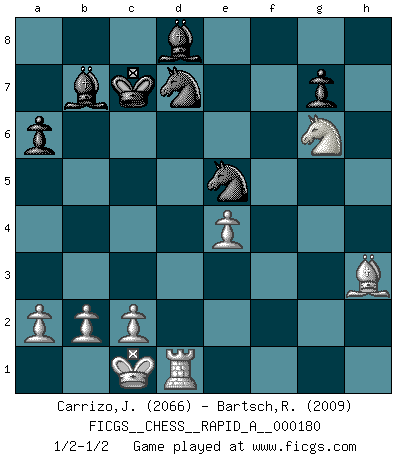 Last move : 1/2-1/2 2015 September 20 18:52:29 [Event "FICGS__CHESS__RAPID_A__000180"] [Site "FICGS"] [Date "2015.07.13"] [Round "1"] [White "Carrizo,Jose"] [Black "Bartsch,Reinhard Andrea"] [Result "1/2-1/2"] [WhiteElo "2066"] [BlackElo "2009"] 1.e4 c5 2.Nf3 d6 3.d4 cxd4 4.Nxd4 Nf6 5.Nc3 a6 6.Be3 e6 7.f3 b5 8.Qd2 Nbd7 9.g4 h6 10.O-O-O b4 11.Nce2 Qc7 12.h4 d5 13.Bf4 e5 14.Bh2 dxe4 15.g5 hxg5 16.hxg5 Rxh2 17.Rxh2 exd4 18.Rh8 Nd5 19.Qxd4 Bb7 20.fxe4 N5b6 21.Qxb4 O-O-O 22.Qd4 Qc4 23.g6 fxg6 24.Qxc4+ Nxc4 25.Bh3 Nce5 26.Nf4 Be7 27.Rxd8+ Bxd8 28.Nxg6 Kc7 1/2-1/2 Sicilian : Najdorf, Byrne (English) attack Queenside Castling by player White (move 10) Queenside Castling by player Black (move 21) This chess game ended in a draw. Follow this game move after move (download)If a ruler does not understand Chess, how can he rule over a kingdom ? (King Khusros II) Ohne Leiden bildet sich kein Charakter. (Ernst Freiherr von Feuchtersleben) Aquel que toma al Peón de Caballo de la Reina, se pasará la noche a dormir en la calle. (Anónimo) Les échecs c'est le défi de l'alpiniste, toujours plus haut, prêt à tout pour monter à l'assaut du Roi ennemi. Les échecs, c'est de la musique en mouvement, un ballet majestueux pour les yeux. C'est de la poésie composée par les fantômes du passé qui au même titre que Rimbaud ou Verlaine méritent notre admiration. Les échecs, c'est de la peinture ou le moindre mouvement modifie le tableau pour en faire un Picasso ou un Van Gogh. Les échecs, c'est tout et rien, c'est la vie et la mort. Jjulie33 sur le forum de France-Echecs. To err is human, but to really foul things up requires a computer. (Farmer's Almanac, 1978)