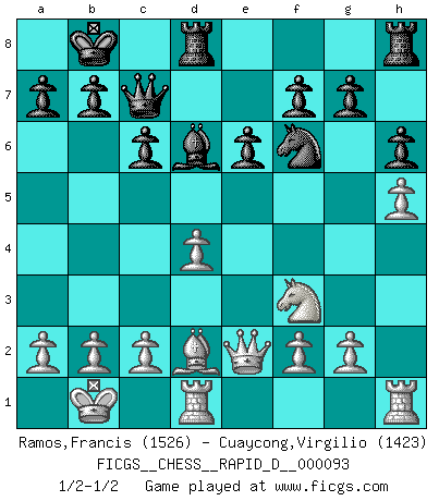 Last move : 1/2-1/2 2015 August 11 15:33:20 [Event "FICGS__CHESS__RAPID_D__000093"] [Site "FICGS"] [Date "2015.07.14"] [Round "1"] [White "Ramos,Francis"] [Black "Cuaycong,Virgilio"] [Result "1/2-1/2"] [WhiteElo "1526"] [BlackElo "1423"] 1.e4 c6 2.d4 d5 3.Nc3 dxe4 4.Nxe4 Bf5 5.Ng3 Bg6 6.h4 h6 7.h5 Bh7 8.Nf3 Nd7 9.Bd3 Bxd3 10.Qxd3 e6 11.Bf4 Qa5+ 12.Bd2 Qc7 13.O-O-O O-O-O 14.Qe2 Ngf6 15.Kb1 Bd6 16.Ne4 Nxe4 17.Qxe4 Nf6 18.Qe2 Kb8 19.Bc3 Nd5 20.Bd2 Nf6 1/2-1/2 Caro-Kann : Classical, 6.h4 Queenside Castling by player White (move 13) Queenside Castling by player Black (move 13) This chess game ended in a draw. Follow this game move after move (download)Even the laziest King flees wildly in the face of a double check ! (Aaron Nimzowitsch) Was ist der Unterschied zwischen einem Strassenarbeiter und einem Schachspieler? --Der Schachspieler bewegt sich ab und zu. (Anonymous) El Ajedrez por encima de todo... ¡es una pelea!. (Emanuel Lasker) Soyez une menace à chaque fois que vous vous asseyez pour jouer. (Ken Smith) Memory is a way of holding onto the things you love, the things you are, the things you never want to lose. (from the television show: The Wonder Years)