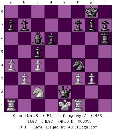 Last move : 0-1 2015 November 3 13:42:23 [Event "FICGS__CHESS__RAPID_D__000093"] [Site "FICGS"] [Date "2015.07.14"] [Round "1"] [White "Klawitter,Bernd"] [Black "Cuaycong,Virgilio"] [Result "0-1"] [WhiteElo "1514"] [BlackElo "1423"] 1.d4 Nf6 2.Bg5 Ne4 3.Bf4 c5 4.f3 Qa5+ 5.c3 Nf6 6.d5 Qb6 7.Bc1 e6 8.e4 exd5 9.exd5 d6 10.Na3 Be7 11.Bb5+ Nbd7 12.Qe2 O-O 13.Bxd7 Bxd7 14.Nc4 Qd8 15.Ne3 Re8 16.Qd1 Nh5 17.Ne2 Bg5 18.Kf2 Qe7 19.Nc2 Bb5 20.Re1 Bxc1 21.Nxc1 Qh4+ 22.Kg1 Nf4 23.a4 Bc4 24.b3 Qg5 25.g3 Bxd5 26.Kf1 Nh3 27.Kg2 Qh5 28.Rf1 Re6 29.c4 Bc6 30.Ne2 Rh6 31.Ng1 Nf4+ 32.Kf2 Qxh2+ 33.Ke1 Re8+ 34.Ne2 Rxe2+ 35.Qxe2 Qxe2+ 0-1 Trompowsky attack (Ruth, Opovcensky Opening) Kingside Castling by player Black (move 12) Player Black won this chess game. Follow this game move after move (download)Chess mastery essentially consists of analyzing Chess positions accurately. (Mikhail Botvinnik) Wenn Spassky eine Figur opfert kannst du genauso gut aufgeben. Aber wenn Tal eine Figur opfert, spiel weiter. Er könnte noch eine weitere opfern, und dann ... wer weiß? (Miguel Najdorf) Yo creo que el Ajedrez posee una magia que es también una ayuda en la edad avanzada. Una rodilla reumática es olvidada durante una partida de Ajedrez y otros eventos pueden parecer algo sin importancia comparada a una catástrofe en el tablero de Ajedrez. (Vlastimil Hort) J'apprécie les joueurs d'est-indienne, c'est grâce à eux que je nourris ma famille depuis tant d'années. (Petrosian) There are more things in heaven and earth than practically anywhere else. (Unknown)