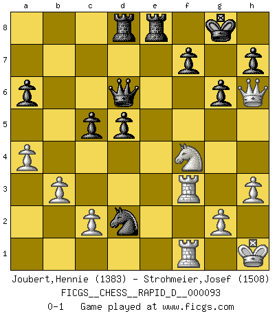 Last move : 0-1 2015 October 9 9:40:11 [Event "FICGS__CHESS__RAPID_D__000093"] [Site "FICGS"] [Date "2015.07.14"] [Round "1"] [White "Joubert,Hennie"] [Black "Strohmeier,Josef"] [Result "0-1"] [WhiteElo "1383"] [BlackElo "1508"] 1.e4 c5 2.Nf3 Nc6 3.d4 cxd4 4.Nxd4 Nf6 5.Nc3 a6 6.Be2 d6 7.O-O g6 8.Nxc6 bxc6 9.Bg5 Bg7 10.Qd2 O-O 11.Rad1 Qc7 12.Bh6 Rb8 13.b3 Nd7 14.Bxg7 Kxg7 15.h3 Nf6 16.f4 Bb7 17.Bf3 Rbd8 18.Qe2 Qa5 19.Qe3 e6 20.a4 Qc7 21.Kh1 c5 22.f5 exf5 23.exf5 Bxf3 24.Qxf3 Nh5 25.f6+ Kg8 26.Qe3 d5 27.Qh6 Qe5 28.Ne2 Nxf6 29.Rde1 Qd6 30.Nf4 Ne4 31.Rf3 Rfe8 32.Ref1 Nd2 0-1 Sicilian defense Kingside Castling by player White (move 7) Kingside Castling by player Black (move 10) Player Black won this chess game. Follow this game move after move (download)Your body has to be in top condition. Your Chess deteriorates as your body does. You can't separate body from mind. (Bobby Fischer) Konzentriere dich auf materielle Gewinne. Nimm, was dir dein Gegner gibt, ausser es gibt einen guten Grund der dagegenspricht. (Robert James Fischer) Combinaciones deslumbrantes son para la mayoría, mover madera es para los pocos. (Georg Kieninger) Les Cavaliers se révèlent fort utiles dans les positions fermées. D'habitude, les Fous sont un peu plus forts que les Cavaliers dans les positions ouvertes. Qu'on le veuille ou non, il restera toujours des exceptions ! Knowledge rests not upon truth alone, but upon error also. (Carl G. Jung)