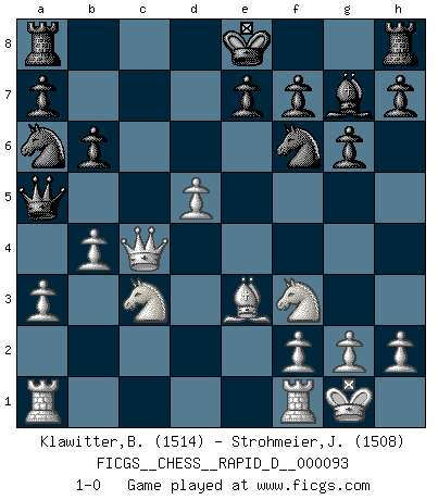 Last move : 1-0 2015 August 23 20:55:56 [Event "FICGS__CHESS__RAPID_D__000093"] [Site "FICGS"] [Date "2015.07.14"] [Round "1"] [White "Klawitter,Bernd"] [Black "Strohmeier,Josef"] [Result "1-0"] [WhiteElo "1514"] [BlackElo "1508"] 1.e4 c5 2.c3 d5 3.exd5 Qxd5 4.d4 Nf6 5.Be3 cxd4 6.cxd4 Nc6 7.Nc3 Qa5 8.d5 Nb4 9.Bb5+ Bd7 10.Bxd7+ Nxd7 11.a3 Na6 12.Nf3 Nf6 13.O-O g6 14.Qb3 b6 15.Qc4 Bg7 16.b4 1-0 Sicilian : Alapin's variation (2.c3) Kingside Castling by player White (move 13) Player White won this chess game. Follow this game move after move (download)I thought the most common mistake [in chess] was the first one: Learning the game :P (Garvin Gray, FICGS forum) Ich habe die Schachforschung dermaßen betrieben, dass sie auf eine wissenschaftliche Basis gestellt wurde. (Mikhail Moiseyevich Botvinik) Cuando tu casa esta en llamas, no puedes ser molestado por tus vecinos. O, como decinos en Ajedrez, si tu Rey esta bajo ataque, no te preocupa perder un Peón del lado de la Reina. (Gary Kasparov) J'ai vu le vaincu d'Echecs jouer des années durant dans l'espoir de la fête de la victoire. Car tu es plus riche de ce qu'elle existe si même elle n'est point pour toi. Ainsi de la perle du fond des mers. (Antoine de Saint-Exupéry) There are 10 types of people in this world: those who understand binary and those who don't. (Anonymous)