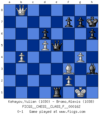 Last move : 0-1 2015 September 29 6:27:2 [Event "FICGS__CHESS__CLASS_F__000162"] [Site "FICGS"] [Date "2015.07.15"] [Round "1"] [White "Kehayov,Yulian"] [Black "Bromo,Alexis"] [Result "0-1"] [WhiteElo "1030"] [BlackElo "1038"] 1.e4 e5 2.Nf3 Nc6 3.d4 exd4 4.Nxd4 Nxd4 5.Qxd4 h6 6.Be2 d6 7.O-O Nf6 8.h3 c5 9.Qd3 a6 10.c4 Be7 11.Nc3 O-O 12.Nd5 Nxd5 13.exd5 Re8 14.b3 Bd7 15.Bb2 Bf6 16.Bxf6 Qxf6 17.Bf3 Bf5 18.Qd2 b5 19.cxb5 axb5 20.a3 b4 21.axb4 Rxa1 22.Rxa1 Qxa1+ 23.Kh2 cxb4 24.Qxb4 Re1 25.g4 Qe5+ 26.Kg2 Bd3 27.Qb8+ Kh7 28.b4 Bf1+ 29.Kg1 Bxh3 0-1 Scotch game Kingside Castling by player White (move 7) Kingside Castling by player Black (move 11) Player Black won this chess game. Follow this game move after move (download)Bobby just drops the pieces and they fall on the right squares. (Miguel Najdorf) Frage: Gibt es etwas was Sie mehr lieben als Autobahnen ohne Tempobegrenzungen? - Antwort: Deutsche Frauen ohne Tempobegrenzungen. (Loek van Wely) Bobby Fischer es el mas grande genio de Ajedrez de todos los tiempos. (Alexander Kotov) Les Echecs mettent en conflit, non pas deux intelligences, mais deux volontés. (Lasker) Memory... is the diary that we all carry with us. (Oscar Wilde, The Importance of Being Earnest)
