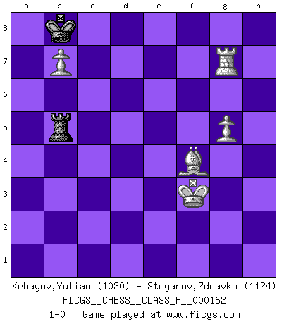 Last move : 1-0 2015 December 23 13:12:23 [Event "FICGS__CHESS__CLASS_F__000162"] [Site "FICGS"] [Date "2015.07.15"] [Round "1"] [White "Kehayov,Yulian"] [Black "Stoyanov,Zdravko"] [Result "1-0"] [WhiteElo "1030"] [BlackElo "1124"] 1.e4 c5 2.d4 cxd4 3.Qxd4 d6 4.Nf3 Nc6 5.Qd1 a6 6.Be2 h6 7.O-O e5 8.c4 Nf6 9.Nc3 Bd7 10.b3 Be7 11.Nd5 Nxd5 12.cxd5 Na7 13.Bb2 Bg4 14.h3 Bh5 15.g4 Bg6 16.Bd3 Bh4 17.Nxh4 Qxh4 18.Kg2 O-O 19.f3 Nc8 20.Qe1 Qg5 21.Qf2 Ne7 22.Ba3 Qf6 23.Qb6 h5 24.Qxb7 h4 25.Bxa6 Qg5 26.Bc1 Qf6 27.Bc4 Rab8 28.Qa7 Ra8 29.Qf2 Nc8 30.Bd2 Rb8 31.Be1 Nb6 32.Qe2 Rfc8 33.Bd3 Nd7 34.Qf2 Nc5 35.Be2 Qg5 36.Qxh4 Qxh4 37.Bxh4 Ra8 38.Rf2 Nxb3 39.Bc4 Rxc4 40.axb3 R4c8 41.Rxa8 Rxa8 42.Be7 Ra7 43.Bxd6 f6 44.b4 Be8 45.f4 exf4 46.Rxf4 Bb5 47.Kg3 Ra3+ 48.Rf3 Ra6 49.Bc5 Kh7 50.h4 Kh6 51.Re3 g6 52.Kf4 Bf1 53.e5 g5+ 54.hxg5+ fxg5+ 55.Kg3 Bc4 56.d6 Be6 57.Rf3 Kg7 58.Rf6 Ra3+ 59.Rf3 Ra6 60.Rc3 Ra4 61.Rd3 Bd7 62.e6 Bxe6 63.d7 Bxd7 64.Rxd7+ Kf6 65.b5 Rc4 66.Be3 Rc3 67.Kf3 Ke6 68.Rd8 Ke7 69.Rb8 Rb3 70.b6 Kd7 71.Rg8 Rb5 72.Rxg5 Rb4 73.Rg7+ Kc8 74.g5 Rb5 75.b7+ Kb8 76.Bf4+ 1-0 Sicilian : Smith-Morra gambit Kingside Castling by player White (move 7) Kingside Castling by player Black (move 18) 10 pieces endgame at move 62 : White KRBPPP , Black KRBP WHITE : King + 1 Rook 1 Bishop 3 Pawns BLACK : King + 1 Rook 1 Bishop 1 Pawn 9 pieces endgame at move 63 : White KRBPP , Black KRBP WHITE : King + 1 Rook 1 Bishop 2 Pawns BLACK : King + 1 Rook 1 Bishop 1 Pawn 8 pieces endgame at move 64 : White KRBPP , Black KRP WHITE : King + 1 Rook 1 Bishop 2 Pawns BLACK : King + 1 Rook 1 Pawn 7 pieces endgame at move 72 : White KRBPP , Black KR WHITE : King + 1 Rook 1 Bishop 2 Pawns BLACK : King + 1 Rook Player White won this chess game. Follow this game move after move (download)Look at Garry Kasparov. After he loses, invariably he wins the next game. He just kills the next guy. That's something that we have to learn to be able to do. (Maurice Ashley) Der 70jährige Viktor Kortschnoi: Die Rentenanstalt wollte mich zwingen in Rente zu gehen. Meine Frau erhält jetzt eine Pension- und ich zahle weiter in die Rentenkasse ein! (Viktor Kortschnoi) En el Ajedrez, tal como es jugado por los Maestros, practicamente la suerte es eliminada. (Emanuel Lasker) Horreur, mais aussi harmonie suprême : qu'y avait-il en effet au monde en dehors des échecs ? Le brouillard, l'inconnu, le non-être... (Vladimir Nabokov) You can only get smarter by playing a smarter opponent. (Revolver, movie)