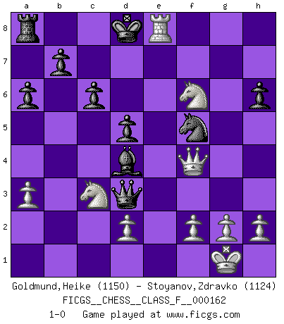 Last move : 1-0 2015 August 30 14:1:59 [Event "FICGS__CHESS__CLASS_F__000162"] [Site "FICGS"] [Date "2015.07.15"] [Round "1"] [White "Goldmund,Heike"] [Black "Stoyanov,Zdravko"] [Result "1-0"] [WhiteElo "1150"] [BlackElo "1124"] 1.b4 e6 2.Bb2 a6 3.c4 Bxb4 4.Bxg7 e5 5.Bxh8 f6 6.e3 Nh6 7.Nf3 d6 8.a3 Ba5 9.Bg7 Nf5 10.Bxf6 Qxf6 11.Be2 e4 12.Ng1 Qxa1 13.Bh5+ Kd8 14.Nh3 Be6 15.O-O Bxc4 16.Re1 Nc6 17.Ng5 h6 18.Bf7 Qa2 19.Bxc4 Qxc4 20.Qg4 Nce7 21.Nxe4 Bb6 22.Nbc3 Qd3 23.Qf4 d5 24.Nf6 c6 25.e4 Bd4 26.exf5 Nxf5 27.Re8+ 1-0 Polish (Sokolsky) opening Kingside Castling by player White (move 15) Player White won this chess game. Follow this game move after move (download)When you don't know what to do, wait for your opponent to get an idea - it's sure to be wrong. (Tarrasch) Rauchen ist dem Schachspieler bei seiner Arbeit, also im Wettkampf, untersagt. (Viktor Kortschnoi) No todos los artistas son jugadores de Ajedrez, pero todos los jugadores de Ajedrez son artistas. (Marcel Duchamp) Si rien de grave n'est détecté lors de l'analyse d'une position, on joue alors le coup. Seconde règle de Blumenfeld. Convictions are more dangerous enemies of truth than lies. (Friedrich Nietzsche)