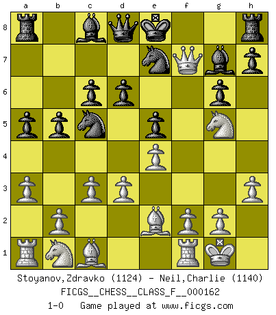Last move : 1-0 2015 July 20 14:31:35 [Event "FICGS__CHESS__CLASS_F__000162"] [Site "FICGS"] [Date "2015.07.15"] [Round "1"] [White "Stoyanov,Zdravko"] [Black "Neil,Charlie"] [Result "1-0"] [WhiteElo "1124"] [BlackElo "1140"] 1.e4 c6 2.Nf3 g6 3.h3 Bg7 4.c3 d6 5.Be2 Nd7 6.a3 e5 7.d3 Ne7 8.O-O b5 9.Ng5 a5 10.Qb3 Nc5 11.Qxf7+ 1-0 Caro-Kann defense Kingside Castling by player White (move 8) Player White won this chess game. Follow this game move after move (download)I guess a certain amount of temperament is expected of Chess geniuses. (Ron Gross) Wenn ich gewinne bin ich ein Genie. Wenn nicht, dann bin ich keines. (Robert James Fischer) Ayuda a tus piezas para que ellas te puedan ayudar. (Paul Morphy) On croit qu'il y a plus de mauvais joueurs que de bons joueurs, c'est faux : Il y a autant de joueurs qui gagnent que de joueurs qui perdent. (Philippe Geluck) If everyone is thinking alike, then somebody isn't thinking. (US General George S. Patton)