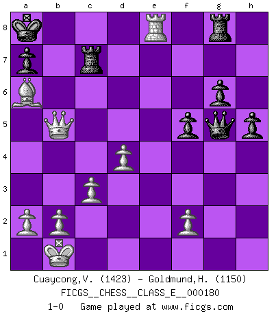 Last move : 1-0 2015 October 4 12:55:29 [Event "FICGS__CHESS__CLASS_E__000180"] [Site "FICGS"] [Date "2015.07.18"] [Round "1"] [White "Cuaycong,Virgilio"] [Black "Goldmund,Heike"] [Result "1-0"] [WhiteElo "1423"] [BlackElo "1150"] 1.e4 d5 2.exd5 Qxd5 3.Nc3 Qa5 4.d4 Nf6 5.Nf3 Bf5 6.Bc4 e6 7.Bd2 c6 8.Qe2 Qc7 9.O-O-O Nbd7 10.Ne5 Bd6 11.g4 Bxg4 12.Nxg4 O-O-O 13.Qf3 h5 14.Nxf6 Nxf6 15.Rdg1 Rdg8 16.Ne4 Nxe4 17.Qxe4 g6 18.h4 Be7 19.Bf4 Bd6 20.Bxd6 Qxd6 21.Rg5 Kb8 22.c3 b5 23.Bxb5 f5 24.Qxc6 Qf4+ 25.Kb1 Rh7 26.Qxe6 Rhg7 27.Re1 Qxh4 28.Ba6 Qxg5 29.Qe5+ Rc7 30.Qb5+ Ka8 31.Re8+ 1-0 Scandinavian defense Queenside Castling by player White (move 9) Queenside Castling by player Black (move 12) Player White won this chess game. Follow this game move after move (download)We like to think. (Gary Kasparov) Wenn du auf das Glück wartest, wird das Leben ziemlich langweilig. (Mikhail Nekhemyevich Tal) Juega la Apertura como un libro, el Juego Medio como un mago y los Finales como una máquina. (Spielmann) Les écrivains ont utilisé les échecs pour analyser les côtés extrêmes de la nature humaine. Dans ce cadre, les échecs offrent un champ d'expérimentation idéal. Mais on pourrait faire la même chose avec la peinture. Et là, en vous référant à Van Gogh, vous ne tirerez pas de conclusion définitive sur les peintres. (Gary Kasparov) I couldn't make any sense out of what this particular thread is about. It sounds like R2 D2 computer speaking. A space fight ?!? Some 'command' problems in Moscow ? Some killers & narcotic addicts attacking some game & a god wannabe ?? (Dinesh De Silva, lost in a russian conflict in FICGS forum)