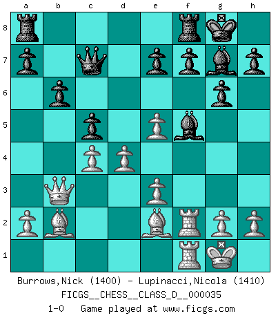 Last move : 1-0 2007 June 16 7:51:24 [Event "FICGS__CHESS__CLASS_D__000035"] [Site "FICGS"] [Date "2007.03.07"] [Round "1"] [White "Burrows,Nick"] [Black "Lupinacci,Nicola"] [Result "1-0"] [WhiteElo "1400"] [BlackElo "1410"] 1.f4 d5 2.Nf3 g6 3.c4 c6 4.e3 Nf6 5.Nc3 Bg7 6.Be2 dxc4 7.Bxc4 Nbd7 8.Ne5 O-O 9.d4 Nb6 10.Be2 Nbd5 11.O-O Nxc3 12.bxc3 Bf5 13.Qb3 Qc7 14.c4 Nd7 15.Bb2 Nxe5 16.fxe5 c5 17.Rf2 b6 18.Raf1 1-0 This chess game has been lost on time (started : 2007.03.07 15:21:31) Bird's Opening Kingside Castling by player Black (move 8) Kingside Castling by player White (move 11) Player White won this chess game. Follow this game move after move (download)You know, comrade Pachman, I don't enjoy being a Minister, I would rather play Chess like you. (Che Guevara) Schach ist ein Teil der Kultur, und wenn es mit der Kultur abwärts geht, geht es auch mit dem Schach abwärts. (Mikhail Moiseyevich Botvinik) Dejen al perfeccionista jugar por correo. (Yasser Seirawan) Que feriez-vous si vous étiez en train de jouer aux échecs et que la fin du monde arrive ? Je continuerais à jouer. (Saint Borromée) A clear conscience is usually the sign of a bad memory. (Unknown)