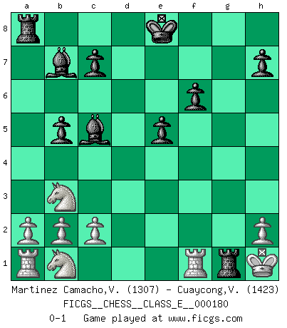 Last move : 0-1 2015 August 11 15:14:46 [Event "FICGS__CHESS__CLASS_E__000180"] [Site "FICGS"] [Date "2015.07.18"] [Round "1"] [White "Martinez Camacho,Victor Hugo"] [Black "Cuaycong,Virgilio"] [Result "0-1"] [WhiteElo "1307"] [BlackElo "1423"] 1.e4 e5 2.Nf3 Nc6 3.Bb5 f5 4.d3 fxe4 5.dxe4 Nf6 6.Bg5 Bc5 7.O-O d5 8.Bxf6 gxf6 9.Qxd5 Qxd5 10.exd5 a6 11.dxc6 axb5 12.cxb7 Bxb7 13.Nfd2 Rg8 14.Nb3 Rxg2+ 15.Kh1 Rxf2 16.Kg1 Rg2+ 17.Kh1 Rg1+ 0-1 Ruy Lopez : Schliemann defense Kingside Castling by player White (move 7) Player Black won this chess game. Follow this game move after move (download)That's what Chess is all about. One day you give your opponent a lesson, the next day he gives you one. (Bobby Fischer) Jede Eröffnung ist gut genug um gespielt zu werden, wenn nur ihr Ruf schlecht genug ist. (Savielly Grigorievitsch Tartakower) ¿Cual es el objetivo de jugar una apertura de gambito?... Para adquirir una reputación de ser un jugador apuesto a costo de perder el juego. (Siegbert Tarrasch) RxDa4 pat (...) Tomorrow's what you make of it. (Horatio Caine, C.S.I. Miami)
