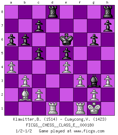 Last move : 1/2-1/2 2015 August 29 6:19:2 [Event "FICGS__CHESS__CLASS_E__000180"] [Site "FICGS"] [Date "2015.07.18"] [Round "1"] [White "Klawitter,Bernd"] [Black "Cuaycong,Virgilio"] [Result "1/2-1/2"] [WhiteElo "1514"] [BlackElo "1423"] 1.e4 e5 2.Nf3 Nc6 3.Bb5 f5 4.Bxc6 dxc6 5.Nc3 Nf6 6.Qe2 fxe4 7.Nxe4 Bg4 8.d3 Be7 9.h3 Bxf3 10.Nxf6+ Bxf6 11.Qxf3 O-O 12.O-O Qd5 13.Qe4 Qxe4 14.dxe4 a6 15.Be3 Rad8 16.Rad1 Kf7 17.f3 Bh4 18.a4 Bg3 19.Bc5 Rh8 20.b3 Ke6 21.Bb4 b6 22.Ba3 c5 23.Bb2 g6 1/2-1/2 Ruy Lopez : Schliemann defense Kingside Castling by player Black (move 11) Kingside Castling by player White (move 12) This chess game ended in a draw. Follow this game move after move (download)Bobby is the most misunderstood, misquoted celebrity walking the face of this earth. (Yasser Seirawan) Ohne Fehler kann es keine Brillanz geben. (Emanuel Lasker) Aunque la mayoría de la gente disfruta observar las partidas de los grandes Maestros de ataque, algunos de los jugadores mas notables en la historia han sido los jugadores silenciosos posicionales. Lentamente ellos te aplastan despojandote de tu espacio, congestionando tus piezas y dejandote virtualmente sin nada que hacer. (Yasser Seirawan) Assurément je connaissais par expérience le mystérieux attrait de ce jeu royal, le seul entre tous les jeux inventés par les hommes qui échappe souverainement à la tyrannie du hasard, le seul où l'on ne doive sa victoire qu'à son intelligence ou plutôt à une certaine forme d'intelligence. Mais n'est-ce pas déjà le limiter injurieusement que d'appeler les échecs un jeu ? N'est-ce pas une science, un art ou quelque chose qui, comme le cercueil de Mahomet entre ciel et terre, est suspendu entre l'un et l'autre, et qui réunit un nombre incroyable de contraires ? [...] C'est une pensée qui ne mène à rien, une mathématique qui n'établit rien, un art qui ne laisse pas d'uvre, une architecture sans matière; et il l'a prouvé néanmoins qu'il était plus durable, à sa manière, que les livres ou que tout autre monument, ce jeu unique qui appartient à tous les peuples et à tous les temps, et dont personne ne sait quel dieu en fit don à la terre pour tuer l'ennui, pour aiguiser l'esprit et stimuler l'âme. Où commence-t-il, où finit-il ? (Stefan Zweig) Real knowledge is to know the extent of one's ignorance. (Confucius)