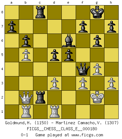 Last move : 0-1 2015 September 25 10:15:25 [Event "FICGS__CHESS__CLASS_E__000180"] [Site "FICGS"] [Date "2015.07.18"] [Round "1"] [White "Goldmund,Heike"] [Black "Martinez Camacho,Victor Hugo"] [Result "0-1"] [WhiteElo "1150"] [BlackElo "1307"] 1.e4 c6 2.d4 d5 3.Nc3 e6 4.e5 Bb4 5.Bd2 Ne7 6.Nf3 Nf5 7.Bd3 Nd7 8.O-O O-O 9.a3 Ba5 10.b4 Bb6 11.Na4 Nxd4 12.Nxd4 Bxd4 13.Bc3 Bxe5 14.Qh5 g6 15.Qe2 Qf6 16.Bxe5 Nxe5 17.Nc5 b6 18.Na6 Nxd3 19.cxd3 Bxa6 20.a4 Bb7 21.Rfc1 Rac8 22.f3 Qd4+ 23.Kf1 Rce8 24.Rab1 e5 25.Rd1 Bc8 26.Qc2 Bd7 27.b5 cxb5 28.axb5 Rc8 29.Qb3 Be6 30.h3 Bf5 31.g4 Be6 32.Kg2 Rc3 33.Qb2 Rfc8 34.Kg3 Qf4+ 35.Kg2 Rc2+ 0-1 Caro-Kann defense Kingside Castling by player White (move 8) Kingside Castling by player Black (move 8) Player Black won this chess game. Follow this game move after move (download)At this time Fischer is simply a level above all the best Chessplayers in the world. (John Jacobs) Dass jemand wie Surab Asmaiparaschwili, der selbst Elopunkte gekauft hat , Vize-Präsident der Fide werden konnte, sagt schon einges über den Zustand dieser Organisation aus. (Joel Lautier) Cuando la partida de Ajedrez termina, el Peón y el Rey regresan a la misma caja. (Irish saying) L'ordinateur a tué l'originalité. Il n'y a plus guère d'aventures sur l'échiquier. (Jacob Murray) Nothing is more important for teaching us to understand the concepts we have than constructing fictitious ones. (Ludwig Wittgenstein)