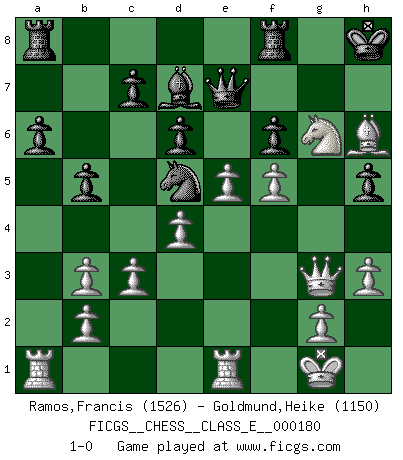Last move : 1-0 2015 September 2 8:46:19 [Event "FICGS__CHESS__CLASS_E__000180"] [Site "FICGS"] [Date "2015.07.18"] [Round "1"] [White "Ramos,Francis"] [Black "Goldmund,Heike"] [Result "1-0"] [WhiteElo "1526"] [BlackElo "1150"] 1.e4 e5 2.Nf3 Nc6 3.Bb5 Bc5 4.O-O Nf6 5.Re1 a6 6.Ba4 b5 7.Bb3 Na5 8.Nxe5 Nxb3 9.axb3 O-O 10.d4 Bb4 11.c3 Be7 12.f4 d6 13.Nc6 Qd7 14.Nxe7+ Qxe7 15.Qf3 Bg4 16.Qg3 h5 17.e5 Nd5 18.h3 Bf5 19.Nd2 g6 20.Nf3 Kg7 21.Nh4 Bd7 22.f5 f6 23.Bh6+ Kh8 24.Nxg6+ 1-0 Ruy Lopez : Classical (Cordel) defense Kingside Castling by player White (move 4) Kingside Castling by player Black (move 9) Player White won this chess game. Follow this game move after move (download)A sacrifice is best refuted by accepting it. (Wilhelm Steinitz) Der Umstand, daß uns eine 7 Stunden Zeitkontrolle ermöglicht eine großartige, tiefe Partie zu spielen, ist für die Massenmedien nicht weiter von Bedeutung. (Alexej Shirov) Al jugar al Ajedrez entonces, podemos aprender: Primero: Previsión... Segundo: Prudencia... Tercero: Cautela... Y al final, aprendemos del Ajedrez el hábito de no ser desanimados por apariencias malas presentes en el estado de nuestros asuntos, el hábito de la esperanza por una oportunidad favorable y la perseveración de los secretos de los recursos. (Benjamin Franklin) Dans le domaine de la peinture, de la gravure et de la sculpture, dès la première décennie de notre siècle, les artistes abandonnent la représentation de la partie d'échecs pour se concentrer sur les pièces, sur les échiquiers et sur toutes les variations auxquelles les unes et les autres peuvent donner lieu. On passe en quelque sorte d'un thème social à un thème musical (au sens de la musica médiévale, c'est-à-dire d'une notion qui inclue le rythme, l'harmonie, la construction et la déconstruction, etc.). Graphiquement et picturalement, l'échiquier apparaît comme une structure ouverte, dynamique, d'une richesse infinie, autorisant toutes les combinatoires et débouchant sur des mouvements et des rythmes de nature exponentielle. (Michel Pastoureau) In God we trust, all others we virus scan. (Anonymous)