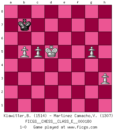 Last move : 1-0 2015 November 19 3:39:30 [Event "FICGS__CHESS__CLASS_E__000180"] [Site "FICGS"] [Date "2015.07.18"] [Round "1"] [White "Klawitter,Bernd"] [Black "Martinez Camacho,Victor Hugo"] [Result "1-0"] [WhiteElo "1514"] [BlackElo "1307"] 1.e4 e5 2.Nf3 Nf6 3.Nc3 Nc6 4.Bb5 Bb4 5.O-O Bxc3 6.dxc3 O-O 7.Bxc6 bxc6 8.Re1 d6 9.Bg5 h6 10.Bh4 g5 11.Bg3 Bg4 12.h3 Bh5 13.Qd3 Rb8 14.b3 Nd7 15.Nh2 Bg6 16.Ng4 Kh7 17.Ne3 Nc5 18.Qe2 Nxe4 19.Nd1 Nxg3 20.fxg3 c5 21.Nf2 Qf6 22.Ne4 Bxe4 23.Qxe4+ Kh8 24.Rf1 Qg7 25.Qd5 f5 26.Rae1 Qd7 27.Rxe5 c6 28.Qe6 Qxe6 29.Rxe6 Rbd8 30.Rxh6+ Kg7 31.Re6 Rd7 32.Rfe1 Rf6 33.Re7+ Rf7 34.R7e6 a5 35.Kh2 Rf6 36.Re7+ Rxe7 37.Rxe7+ Kg6 38.a4 d5 39.Ra7 d4 40.cxd4 cxd4 41.Rxa5 f4 42.gxf4 Rxf4 43.Rc5 Rf6 44.a5 Kh6 45.a6 Kh5 46.a7 Rf8 47.Rxc6 Ra8 48.Rc7 Kg6 49.Kg3 Kf6 50.Kg4 Ke6 51.Kxg5 Kd6 52.Rb7 Kc6 53.Rh7 Kb6 54.Kf4 Rxa7 55.Rxa7 Kxa7 56.Ke4 Kb6 57.Kxd4 Kc6 58.c4 Kd6 59.b4 Kc6 60.b5+ Kc7 61.c5 Kb7 62.Kd5 Kc7 63.g4 Kb7 64.g5 1-0 Petrov Three knights game Kingside Castling by player White (move 5) Kingside Castling by player Black (move 6) 10 pieces endgame at move 51 : White KRPPPPP , Black KRP WHITE : King + 1 Rook 5 Pawns BLACK : King + 1 Rook 1 Pawn 9 pieces endgame at move 54 : White KRPPPP , Black KRP WHITE : King + 1 Rook 4 Pawns BLACK : King + 1 Rook 1 Pawn 8 pieces endgame at move 55 : White KRPPPP , Black KP WHITE : King + 1 Rook 4 Pawns BLACK : King + 1 Pawn 7 pieces endgame at move 55 : White KPPPP , Black KP WHITE : King + 4 Pawns BLACK : King + 1 Pawn 6 pieces endgame at move 57 : White KPPPP , Black K WHITE : King + 4 Pawns BLACK : King + Player White won this chess game. Follow this game move after move (download)You may learn much more from a game you lose than from a game you win. You will have to lose hundreds of games before becoming a good player. (Jose Raul Capablanca) Konzentriere dich auf materielle Gewinne. Nimm, was dir dein Gegner gibt, ausser es gibt einen guten Grund der dagegenspricht. (Robert James Fischer) Yo adoro todas la posiciones. Denme una partida posicional difícil, y la jugaré. Pero posiciones totalmente ganadas, no las tolero. (Hein Donner) Vous savez, camarade Pachman, je n'éprouve pas de plaisir à être ministre, je jouerais plutôt aux échecs comme vous, ou alors ferais une révolution au Venezuela. (Che Guevara à Ludek Pachman, 'Checkmate in Prague', 1975) Creativity is allowing yourself to make mistakes. Art is knowing which ones to keep. (Scott Adams)
