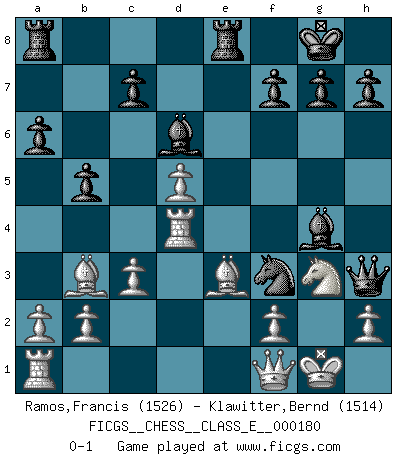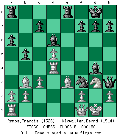Last move : 0-1 2015 August 23 16:11:23 [Event "FICGS__CHESS__CLASS_E__000180"] [Site "FICGS"] [Date "2015.07.18"] [Round "1"] [White "Ramos,Francis"] [Black "Klawitter,Bernd"] [Result "0-1"] [WhiteElo "1526"] [BlackElo "1514"] 1.e4 e5 2.Nf3 Nc6 3.Bb5 a6 4.Ba4 Nf6 5.O-O Be7 6.Re1 b5 7.Bb3 Bb7 8.c3 d5 9.exd5 Nxd5 10.Nxe5 Nxe5 11.Rxe5 Nf4 12.d4 Nxg2 13.d5 Nh4 14.Qe2 Ng6 15.Re3 O-O 16.Rd3 Bd6 17.Be3 Re8 18.Qd1 Bc8 19.Nd2 Qh4 20.Nf1 Ne5 21.Rd4 Qh3 22.Ng3 Bg4 23.Qf1 Nf3+ 0-1 Ruy Lopez : Trajkovic counter-attack Kingside Castling by player White (move 5) Kingside Castling by player Black (move 15) Player Black won this chess game. Follow this game move after move (download)No price is too great for the scalp of the enemy King. (Koblentz) Im Internet Chess Club betrug mein Rating vorübergehend 3350 ELO-Punkte. (Sergej Karjakin) De eso se trata el Ajedrez. Un día le das una lección a tu oponente y al día siguiente el te da una a tí. (Bobby Fischer) La vie est comme un jeu d'échecs : nous esquissons un plan, mais celui-ci est tributaire de ce que daignent faire l'adversaire aux échecs et le destin dans la vie. (Arthur Schopenhauer) Kids, you tried your best and you failed miserably. The lesson is, never try. (Simpsons)