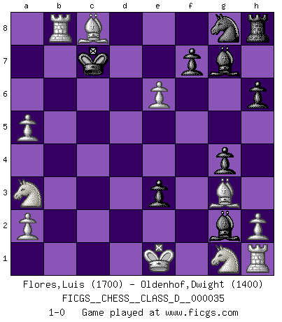 Last move : 1-0 2007 March 18 14:15:27 [Event "FICGS__CHESS__CLASS_D__000035"] [Site "FICGS"] [Date "2007.03.07"] [Round "1"] [White "Flores,Luis"] [Black "Oldenhof,Dwight"] [Result "1-0"] [WhiteElo "1700"] [BlackElo "1400"] 1.d4 d5 2.Bg5 h6 3.Bh4 g5 4.Bg3 Bg7 5.e3 a6 6.f4 g4 7.c4 c5 8.Qb3 Be6 9.Qxb7 Nd7 10.cxd5 Qa5+ 11.b4 Bxd5 12.Qxa8+ Bxa8 13.bxa5 cxd4 14.Na3 dxe3 15.Rc1 Kd8 16.Bxa6 Nb8 17.Rc8+ Kd7 18.Rxb8 Bxg2 19.Bc8+ Kc7 20.f5 e5 21.fxe6 1-0 Levitsky attack (Queen's Bishop attack) Player White won this chess game. Follow this game move after move (download)First-class players lose to second class players because second-class players sometimes play a first-class game. (Tarrasch) Es ist nicht das erste mal, dass sich die FIDE dem Arabischen Geld gebeugt hat (über die FIDE WM 2004 in Lybien). (Larry Evans) Por esta medida (el intervalo entre Fischer y sus contemporaneos), yo le considero el mas grande campeón mundial. (Garry Kasparov) RxDa4 pat (...) Wisdom is the reward you get for a lifetime of listening when you'd have preferred to talk. (Doug Larson)