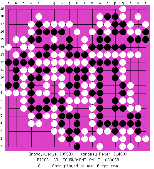 Last move : 0-1 2015 December 4 21:54:31 [Event "FICGS__GO__TOURNAMENT_KYU_I__000059"] [Site "FICGS"] [Date "2015.07.20"] [Round "1"] [Black "Bromo,Alexis"] [White "Korossy,Peter"] [Result "0-1"] [Rating 1 "0988"] [Rating 2 "1480"] 1.q16 d4 2.q4 d16 3.k4 k16 4.k10 q10 5.d10 r6 6.p6 q7 7.p7 r13 8.r15 o17 9.p17 o16 10.p16 f17 11.f14 f12 12.e13 e12 13.d12 d13 14.c13 d14 15.e15 d11 16.c12 c11 17.b11 c10 18.b10 c9 19.b9 c14 20.b14 b15 21.d15 c15 22.e16 d17 23.e17 e18 24.f16 g17 25.g16 h17 26.h16 j17 27.j15 h13 28.h14 g13 29.g14 g15 30.j14 k12 31.k13 j12 32.l13 l12 33.m12 m13 34.m14 n13 35.n14 l15 36.n12 o13 37.o14 p13 38.p14 l14 39.j13 m11 40.o12 q12 41.p12 q13 42.n11 m10 43.n10 m9 44.n9 m7 45.n7 m6 46.n6 m5 47.n5 m4 48.n4 g4 49.h5 j6 50.j5 h3 51.j3 l3 52.k3 r3 53.r4 q3 54.p3 p2 55.o2 q2 56.s3 s2 57.s4 t2 58.p1 r1 59.o1 q1 60.q8 r8 61.q6 r7 62.q9 r9 63.p10 q11 64.p11 o3 65.p4 n3 66.n2 m2 67.o4 n1 68.m8 l8 69.n8 b8 70.d9 c8 71.a9 b13 72.b12 a14 73.a12 a8 74.e11 h10 75.j9 h9 76.k8 l9 77.k9 k7 78.l11 h8 79.f13 g12 80.f11 g11 81.l10 l7 82.j11 f10 83.e10 f9 84.d8 c7 85.d7 c6 86.d6 d5 87.e5 g5 88.h6 g6 89.h7 j7 90.g7 e4 91.f6 f8 92.f7 f5 93.h4 g3 94.j2 h2 95.k5 e8 96.e6 k2 97.k1 l2 98.r5 s6 99.s5 r17 100.o15 q18 101.p18 s16 102.s15 s18 103.q14 m16 104.o18 n18 105.t16 t17 106.t15 r16 107.q17 q19 108.n16 n17 109.n15 s13 110.k11 h12 111.h11 g10 0-1 Here are the names of the openings (joseki) played in the four corners : Corner q4 : q4 r6 Hoshi (Hwajeom, Seongjeom, Xingwei`) 4-4 Point. The star or hoshi (4-4) point, emphasizing influence at the potential expense of territory. Ikken Kakari (Hankan Keolch'im, Yi Gua`jiao~, 1-Space Low Approach). White 2 is the standard approach move to the 4-4. Corner q16 : q16 r13 Hoshi (Hwajeom, Seongjeom, Xingwei`) 4-4 Point. The star or hoshi (4-4) point, emphasizing influence at the potential expense of territory. Niken Kakari (Dukan Keolch'im, E`r Gua`jiao~, 2-Space Low Approach). Black typically answers by 7-3 or 3-5 (which is not joseki). Player White won this Go (weiqi, baduk) game. Follow this game move after move (download)Don't count territory held by only one eye. (Anonymous) I'll be back. (Arnold Schwarzenegger)